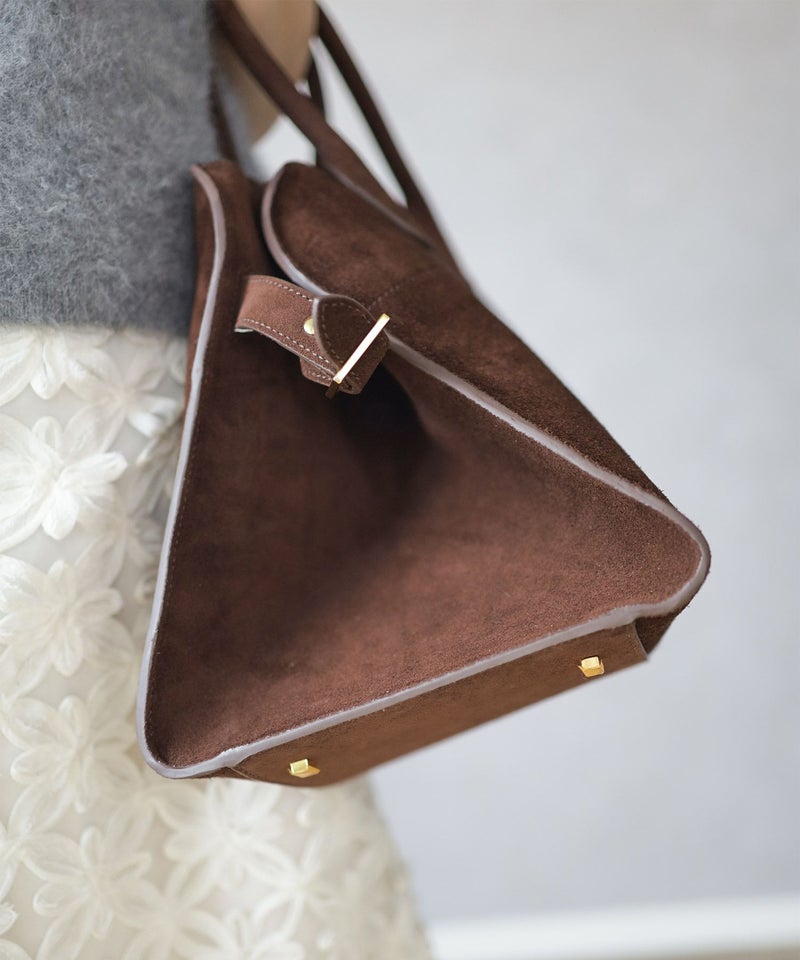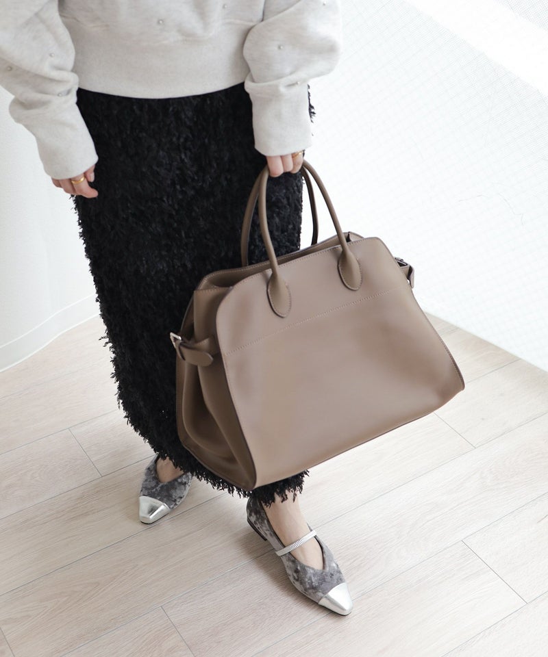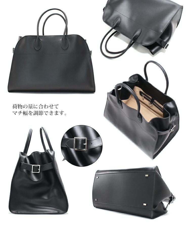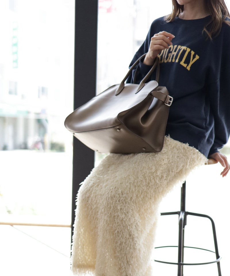 サイドのベルトで2段階マチを調整できるので、荷物の量に合わせて美しいシルエットをキープできるのも嬉しいポイントです。