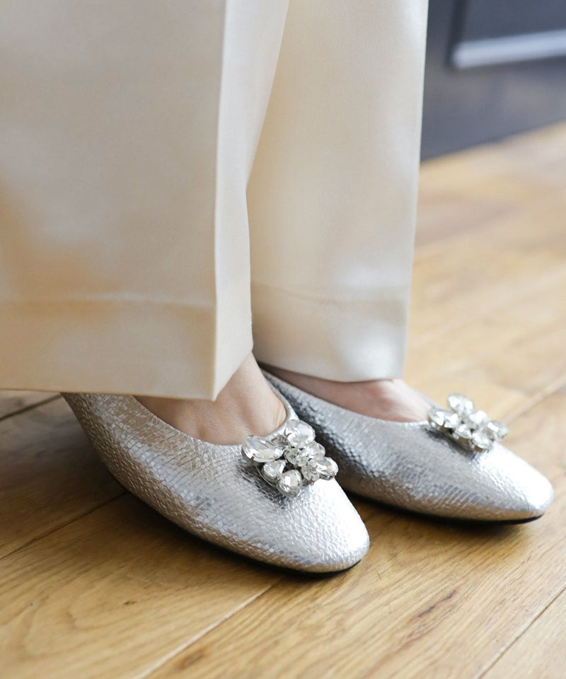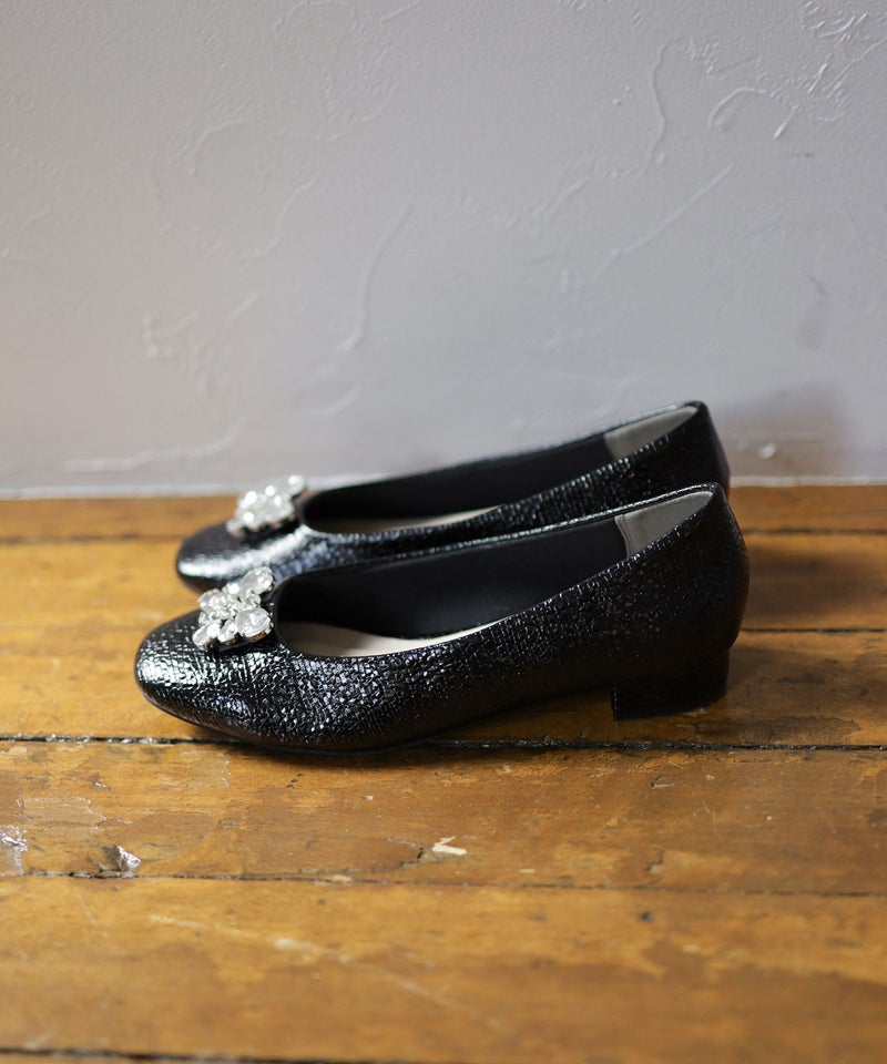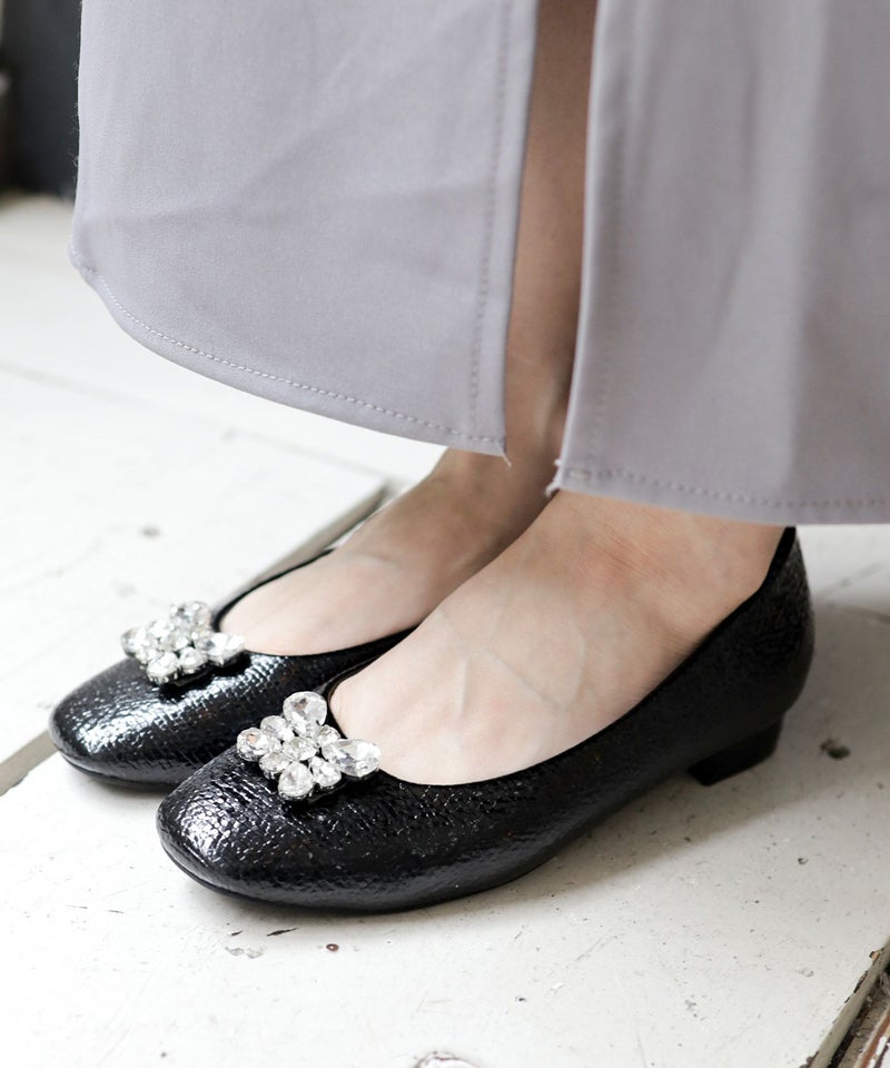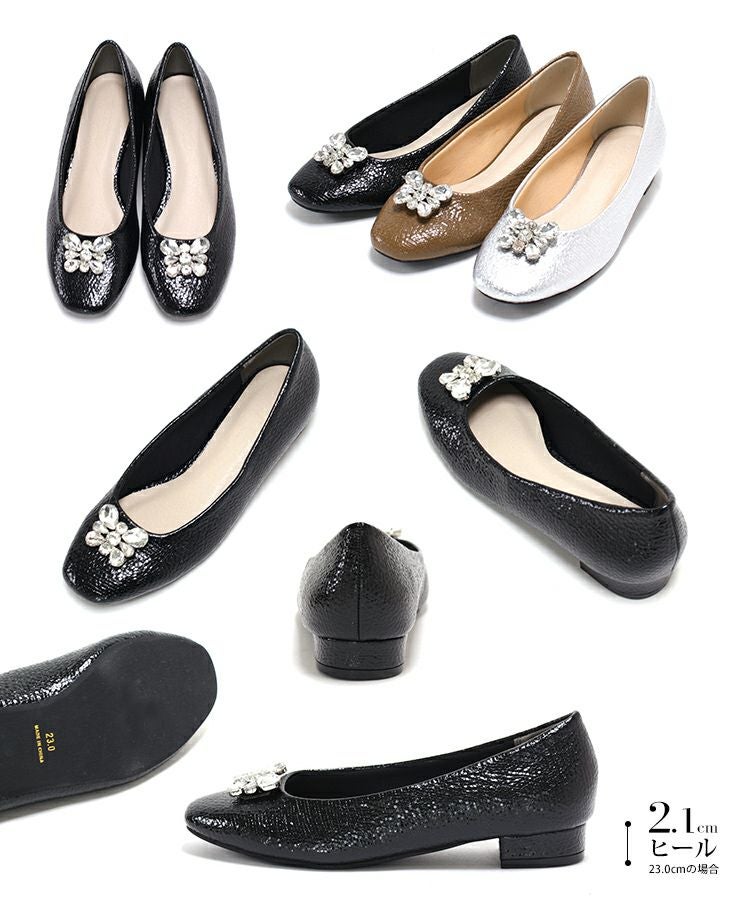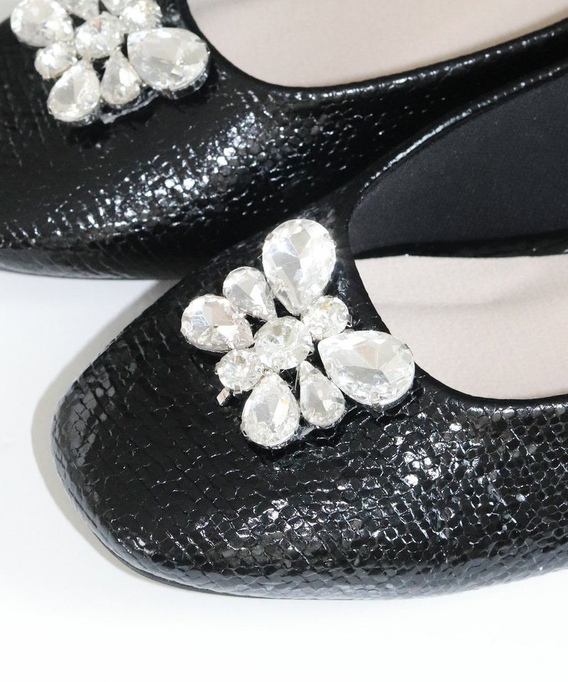 きらっと輝くビジューと光沢感のある型押し素材で足元を彩るパンプス。