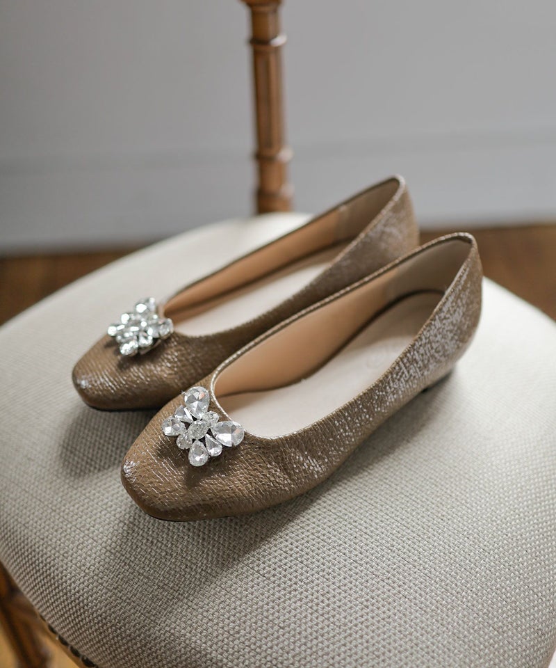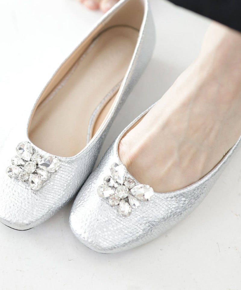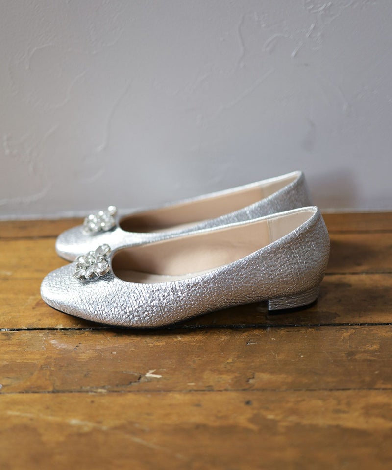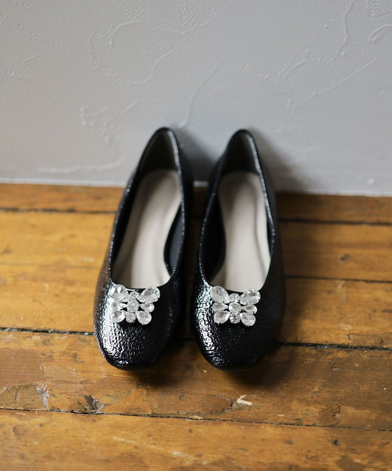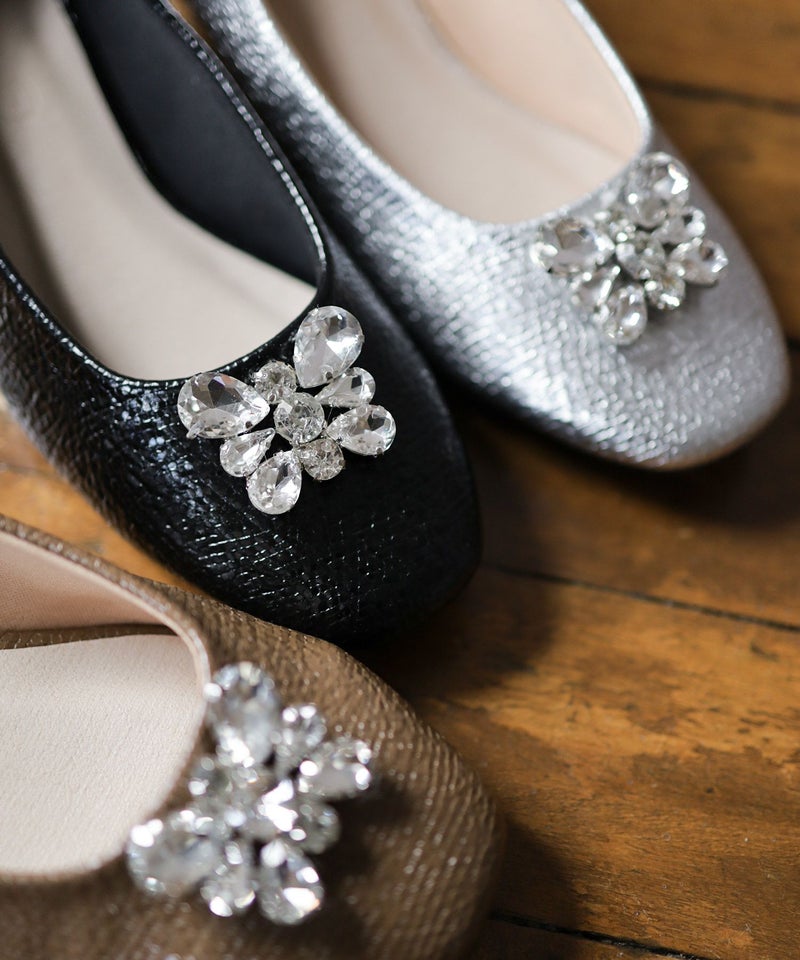 きらっと輝くビジューと光沢感のある型押し素材で足元を彩るパンプス。