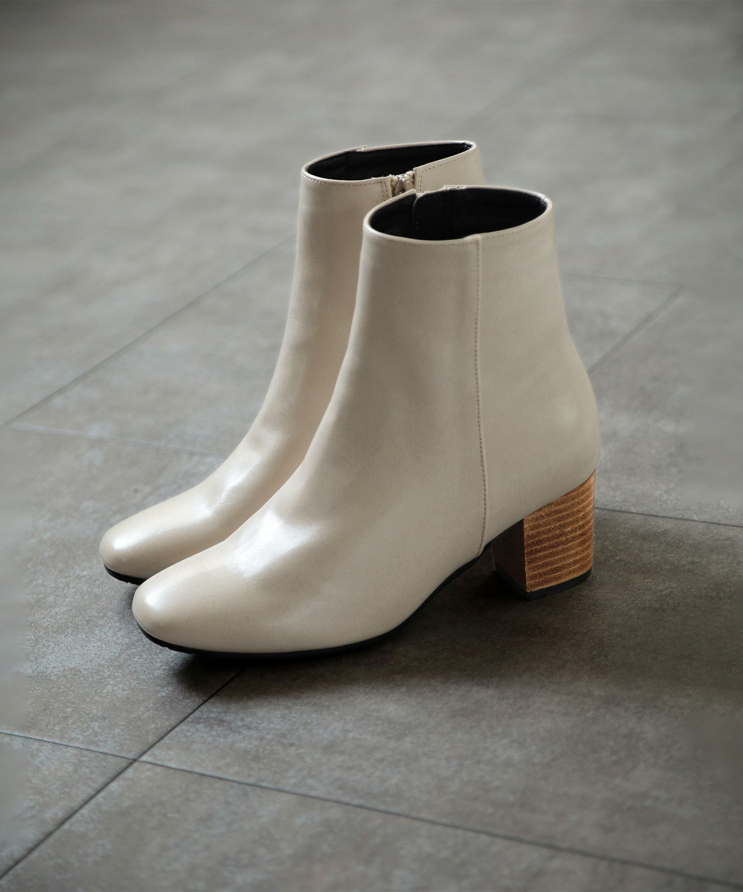 4. 高級ウッドヒールのスクエアトゥショートブーツ