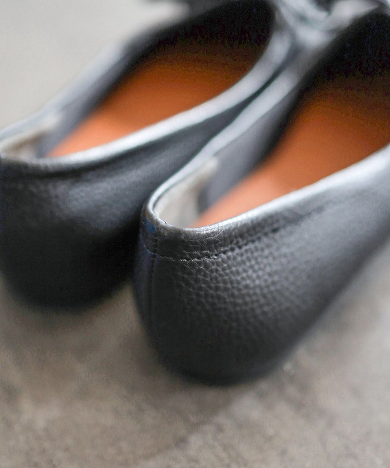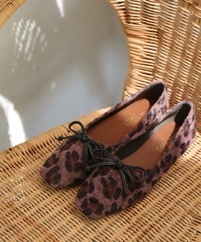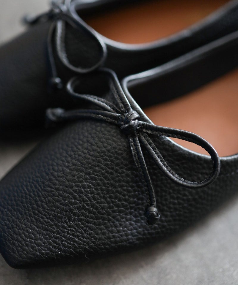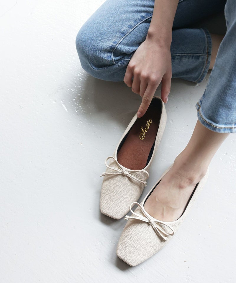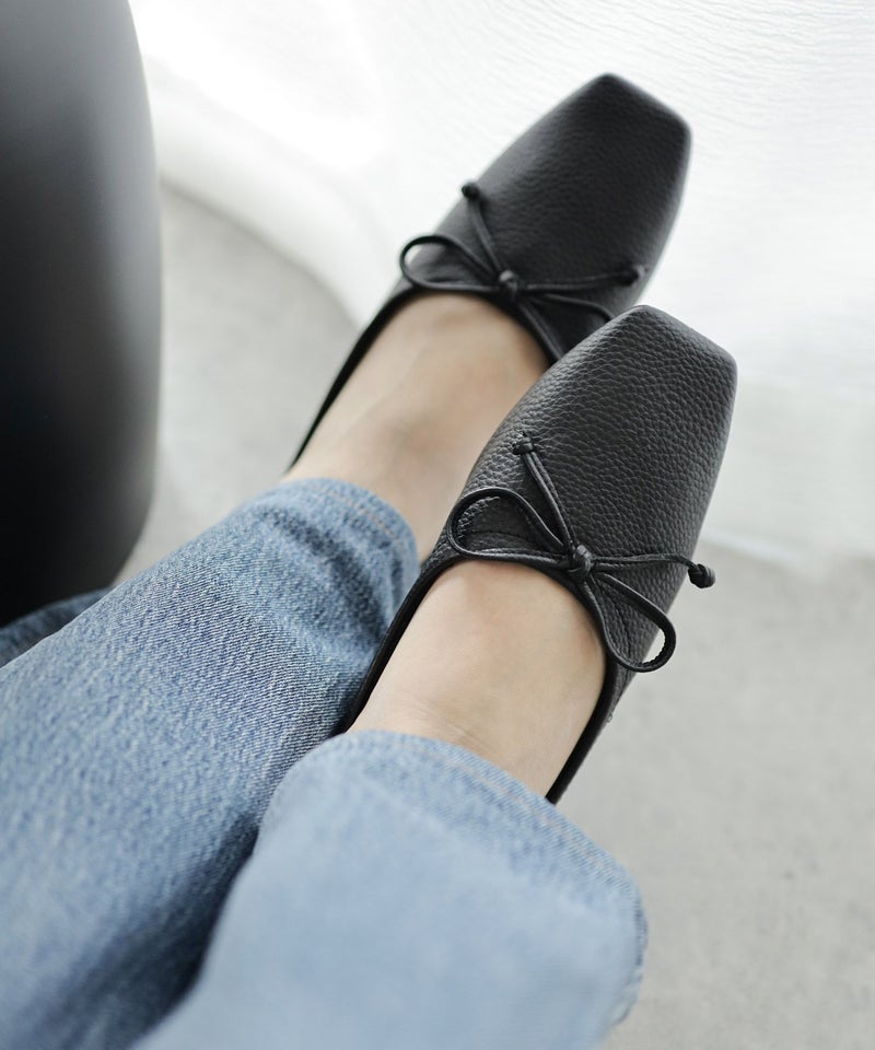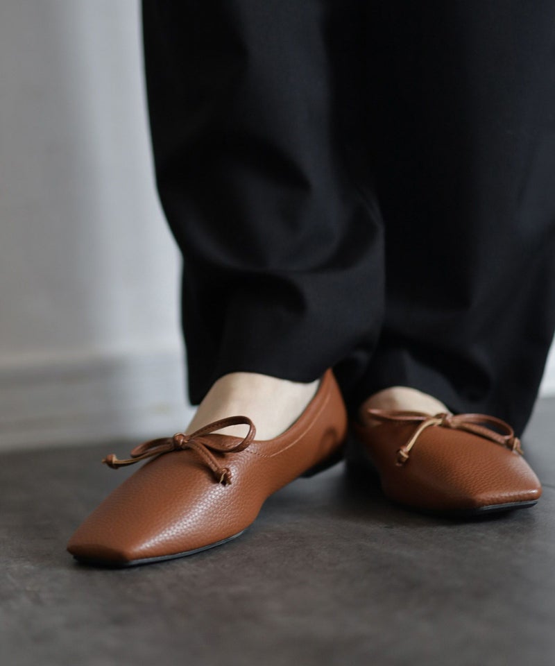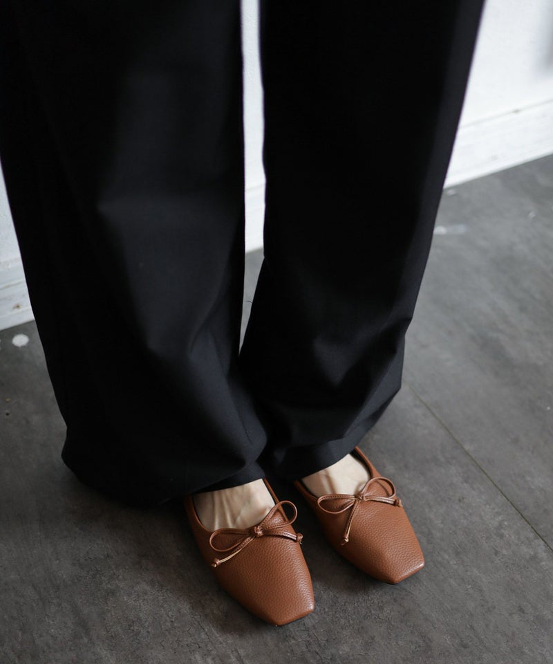 ほんのりレトロな雰囲気の丸みを帯びないエッジの効いたスクエアトゥで今年らしい新鮮さを添えたバブーシュ見えするバレエシューズ。