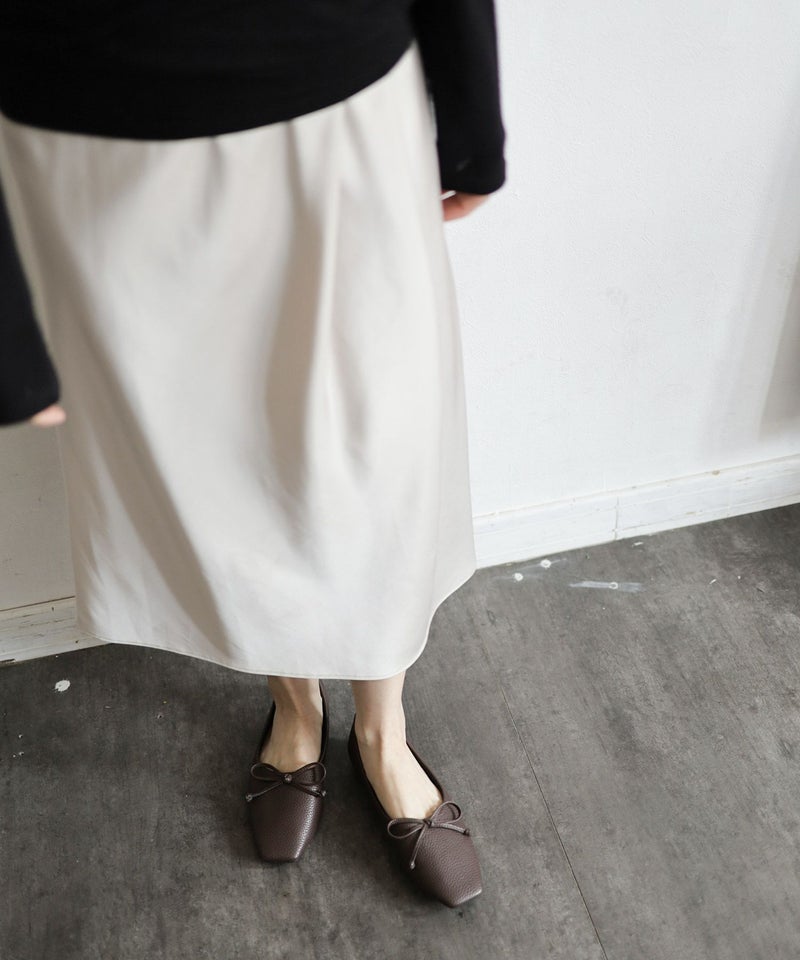 スクエアトゥでスタイリッシュでクールな印象を持たせつつも、靴と同素材のさりげないリボンが女性らしさを忘れないポイントに。
