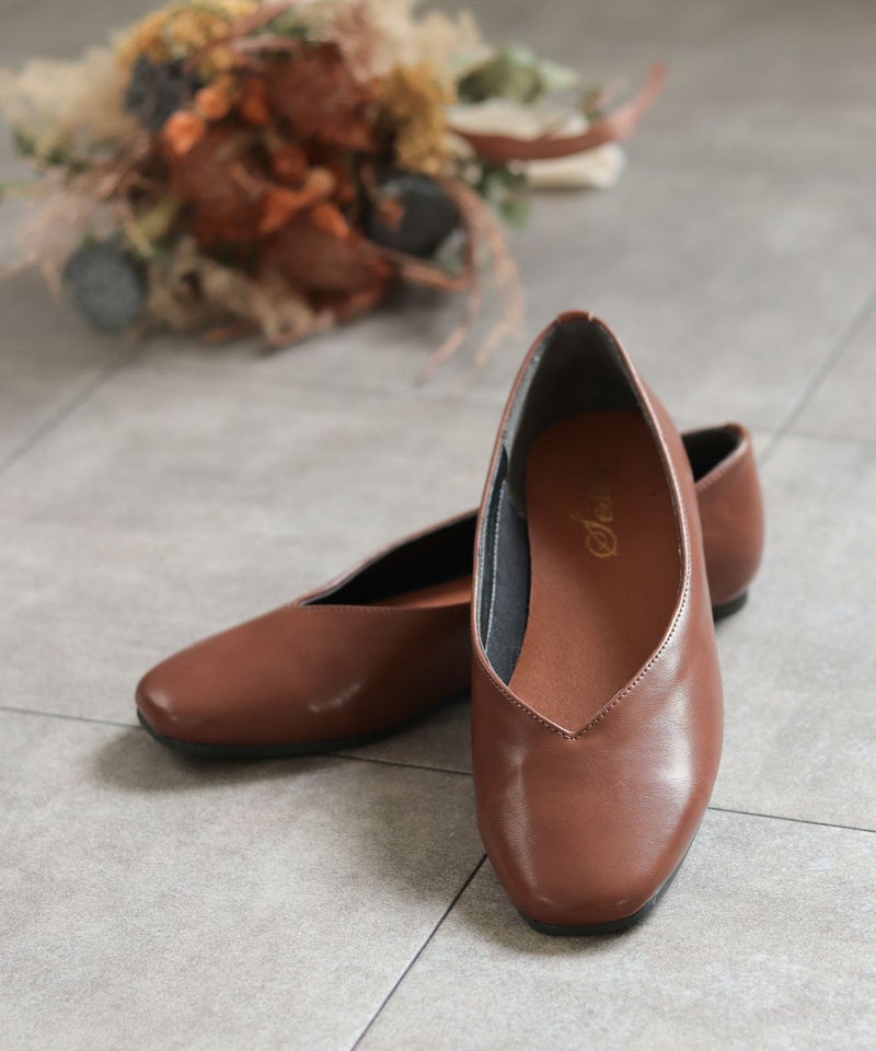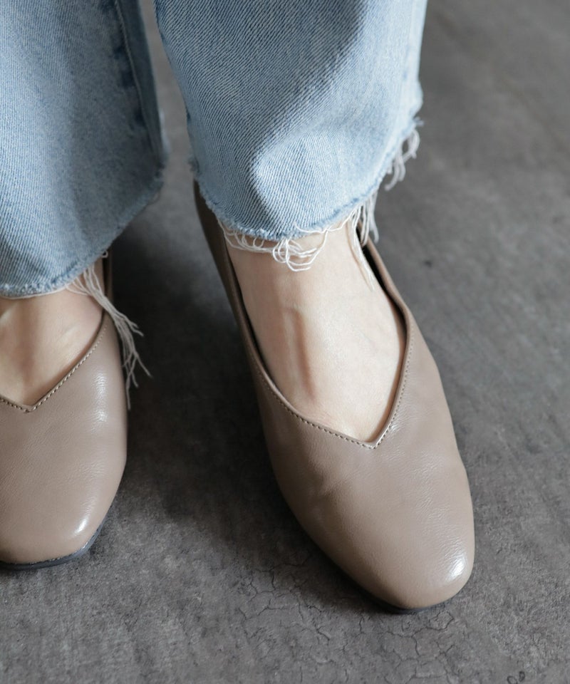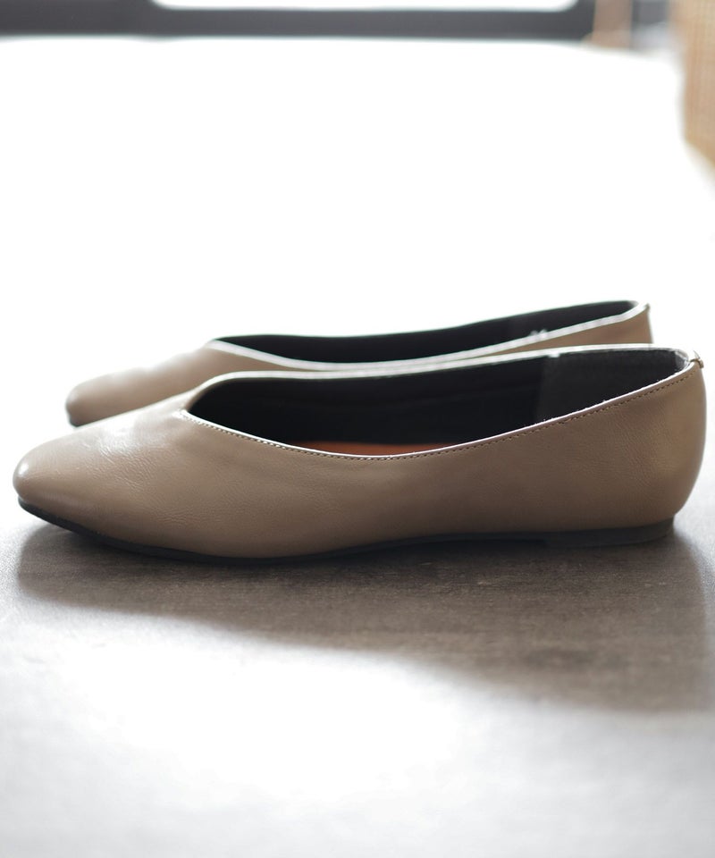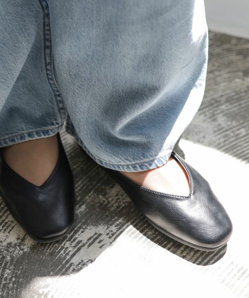 商品説明モードな印象で大人女子に人気のVカットの履き口がポイントのフラットシューズ。