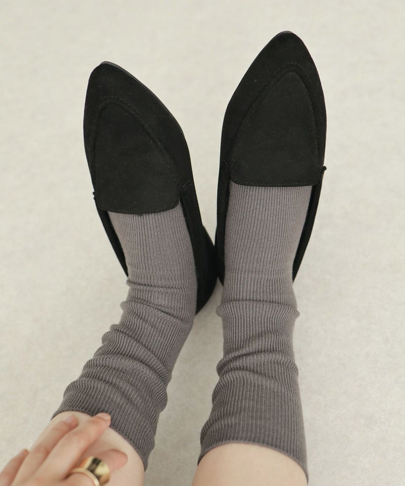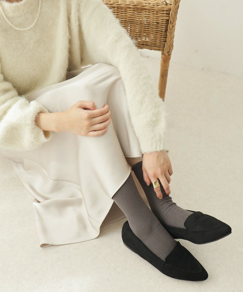 カジュアルな印象が強いモカシンも、ポインテッドトゥデザインにすることで足元を綺麗に魅せ、すっきり女性らしい印象に。