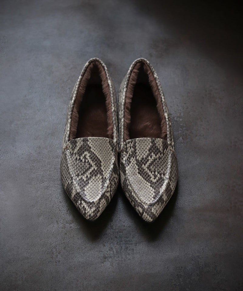同色のファーで仕上げることでカジュアルすぎず、きれいめに大人が履けるモカシンに仕上げました。