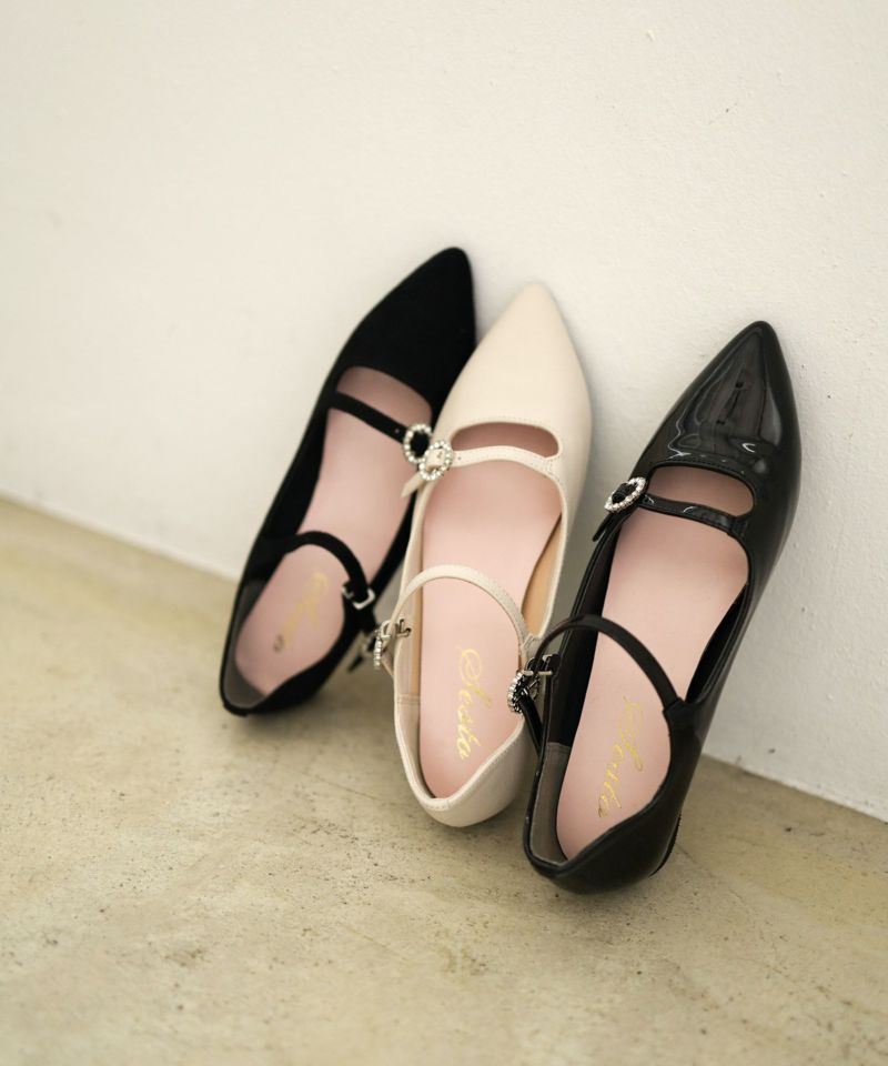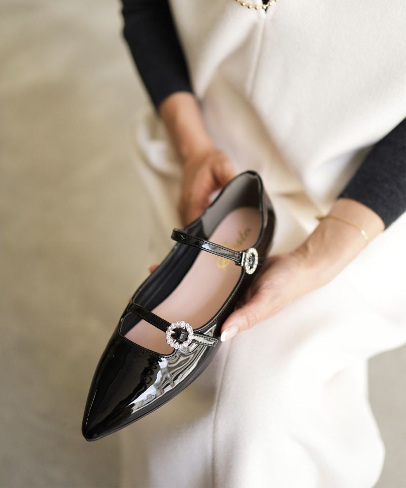 ビジューバックルダブルストラップポインテッドトゥフラットパンプス
