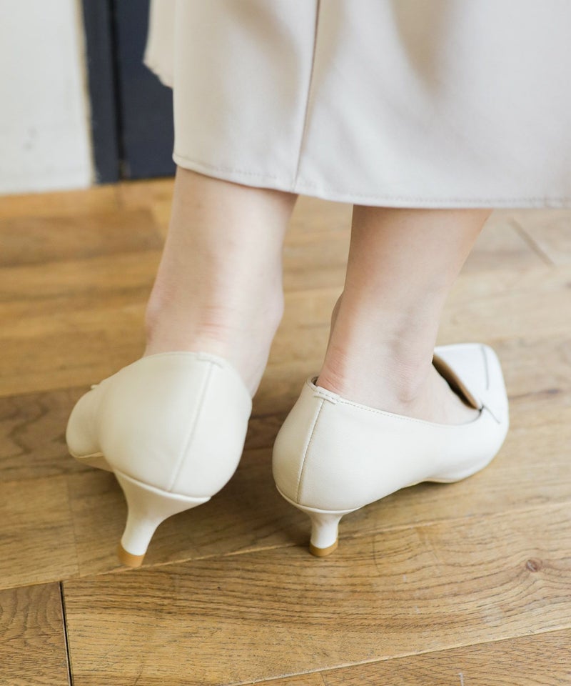 ヒールもくびれたシルエットのキトゥンヒールでバックスタイルもとことんレディに。