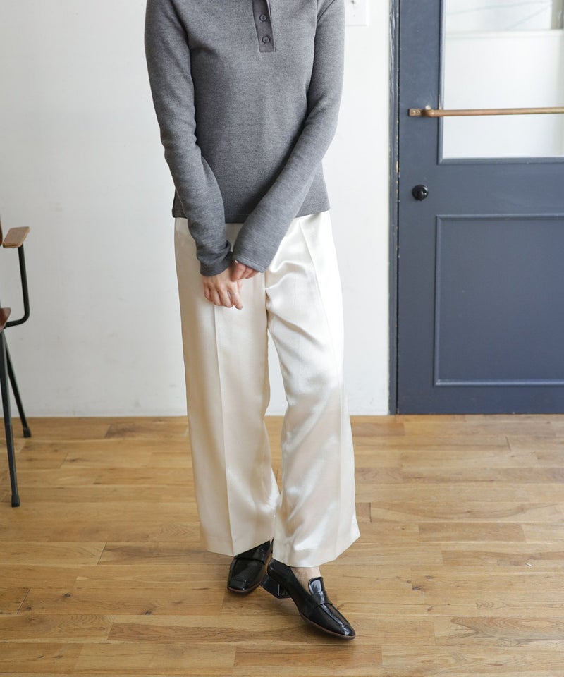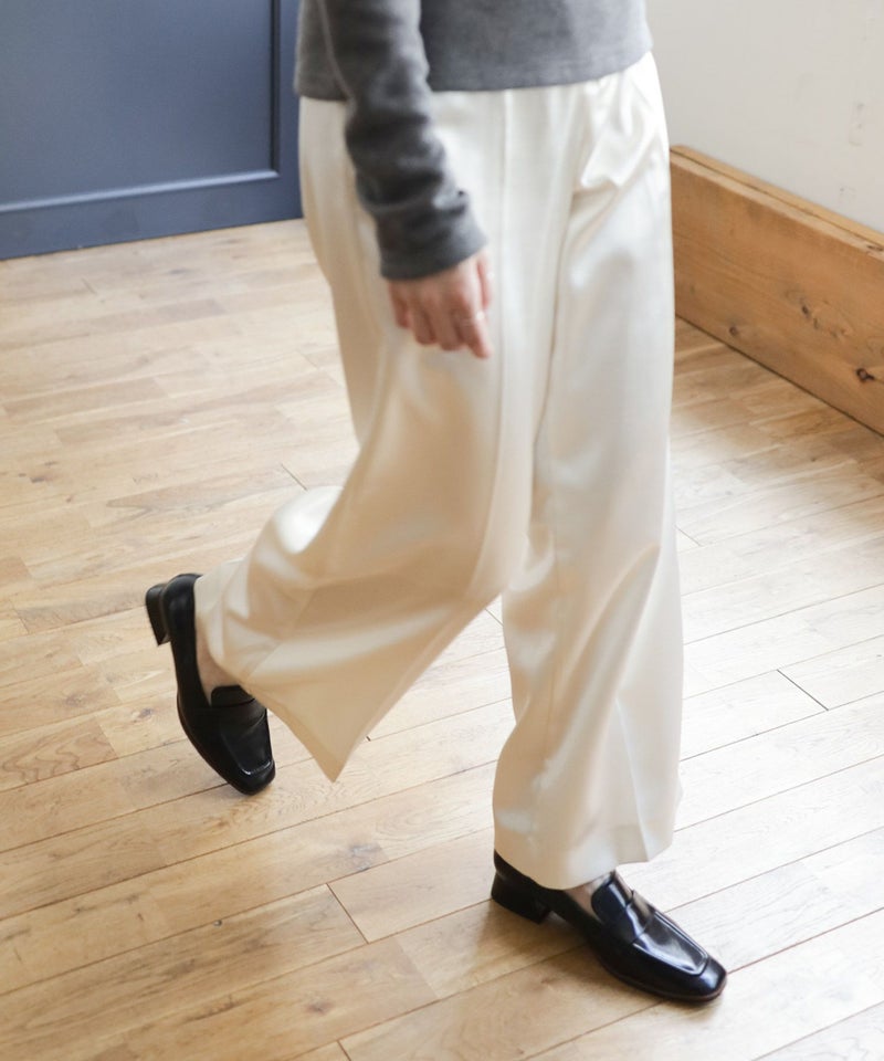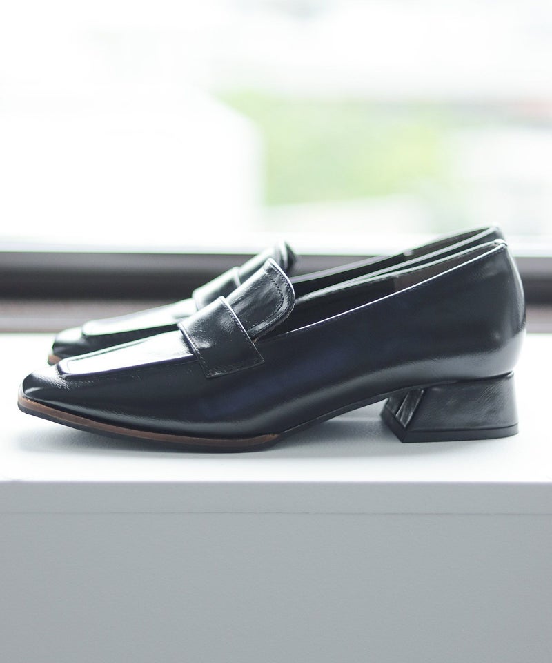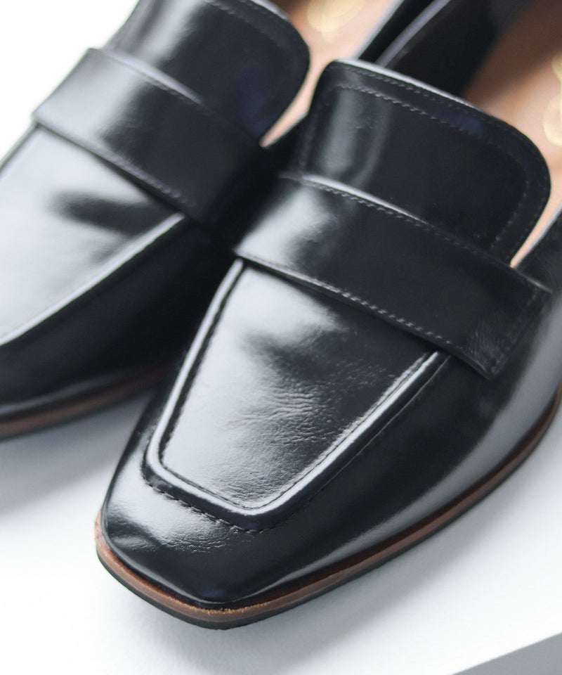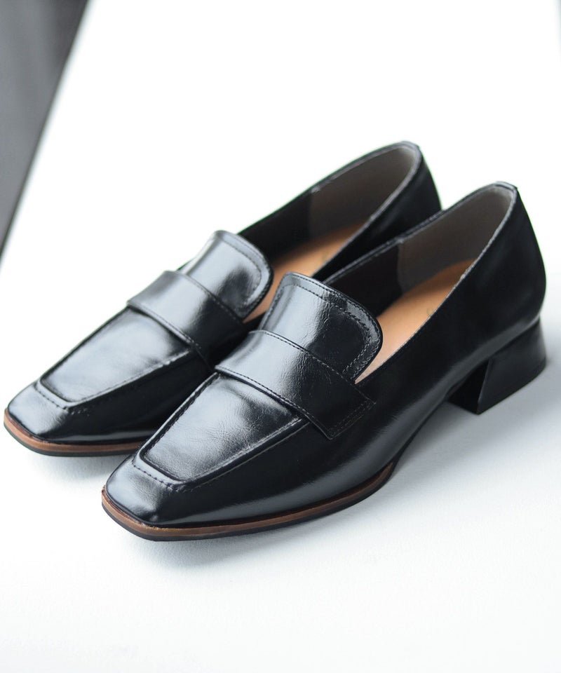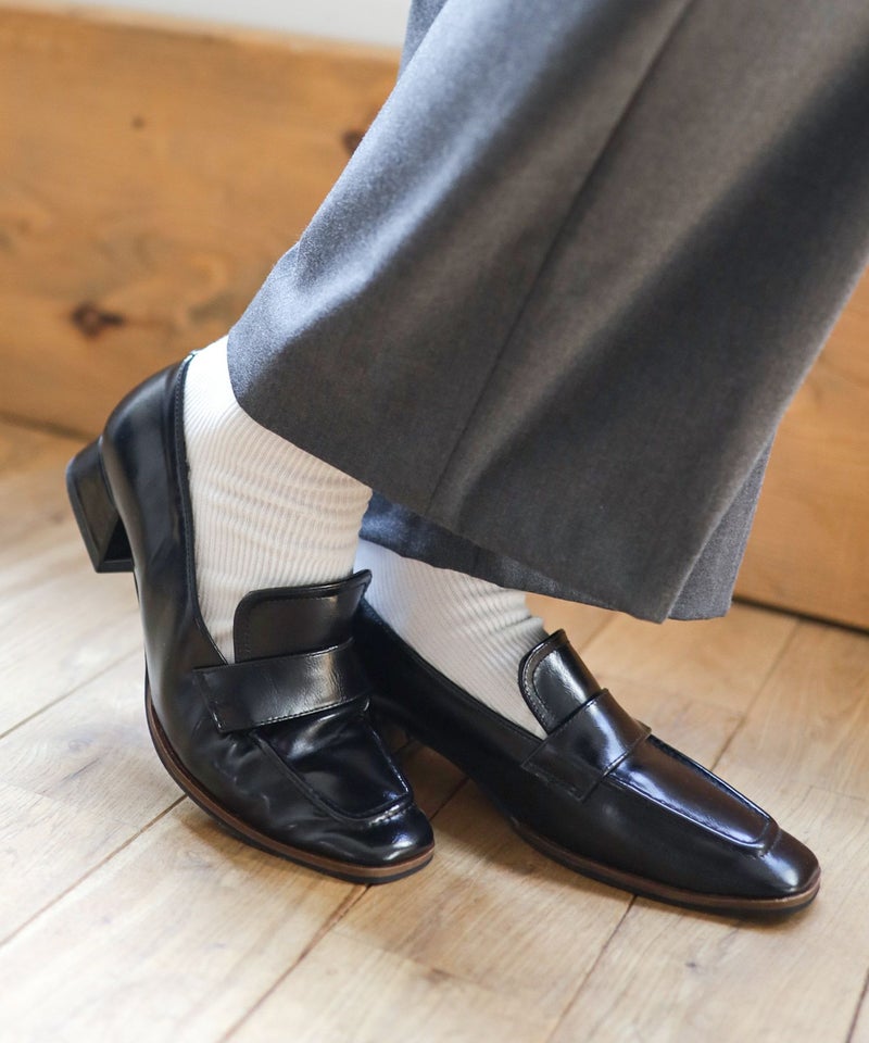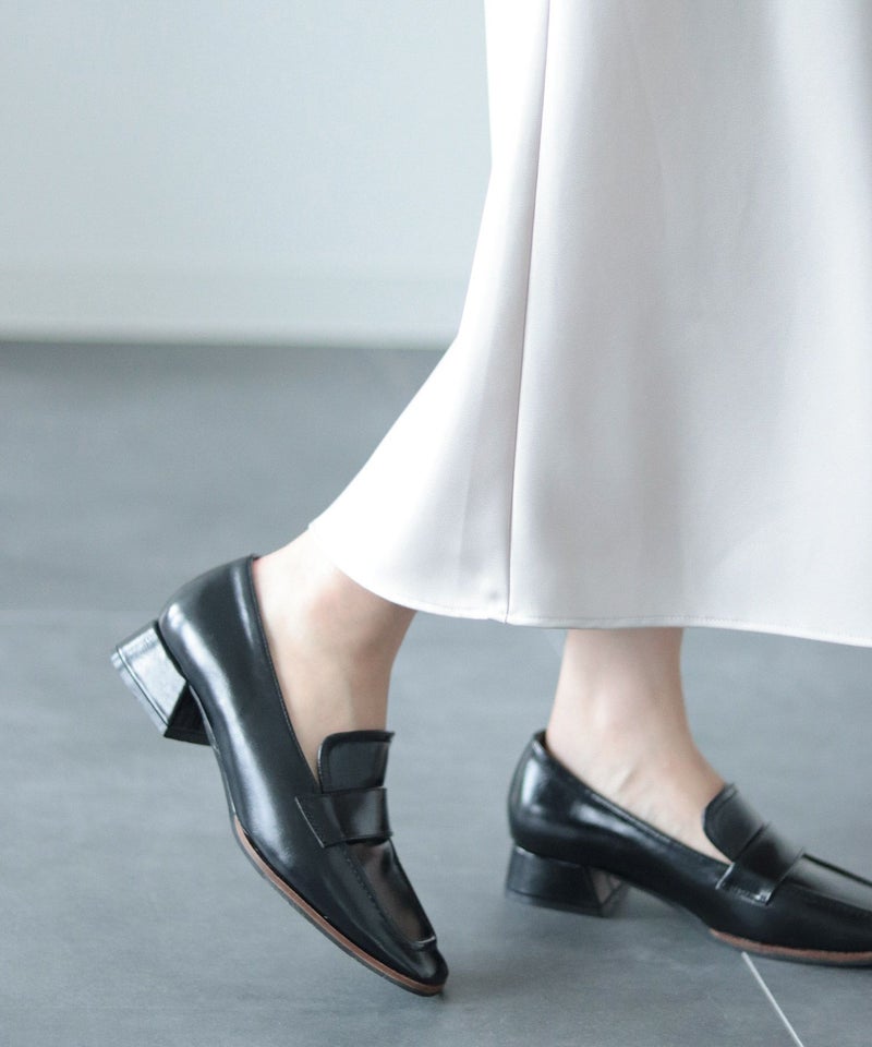 【POINT1】トラッド感のあるローファーに、スリムなスクエアトゥとヒールを組み合わせることで、上品さとエレガントさを兼ね備えたデザインに仕上げています。甲深でシンプルなデザインがトレンド感を漂わせ、着こなしを大人っぽくアップデートしてくれます。