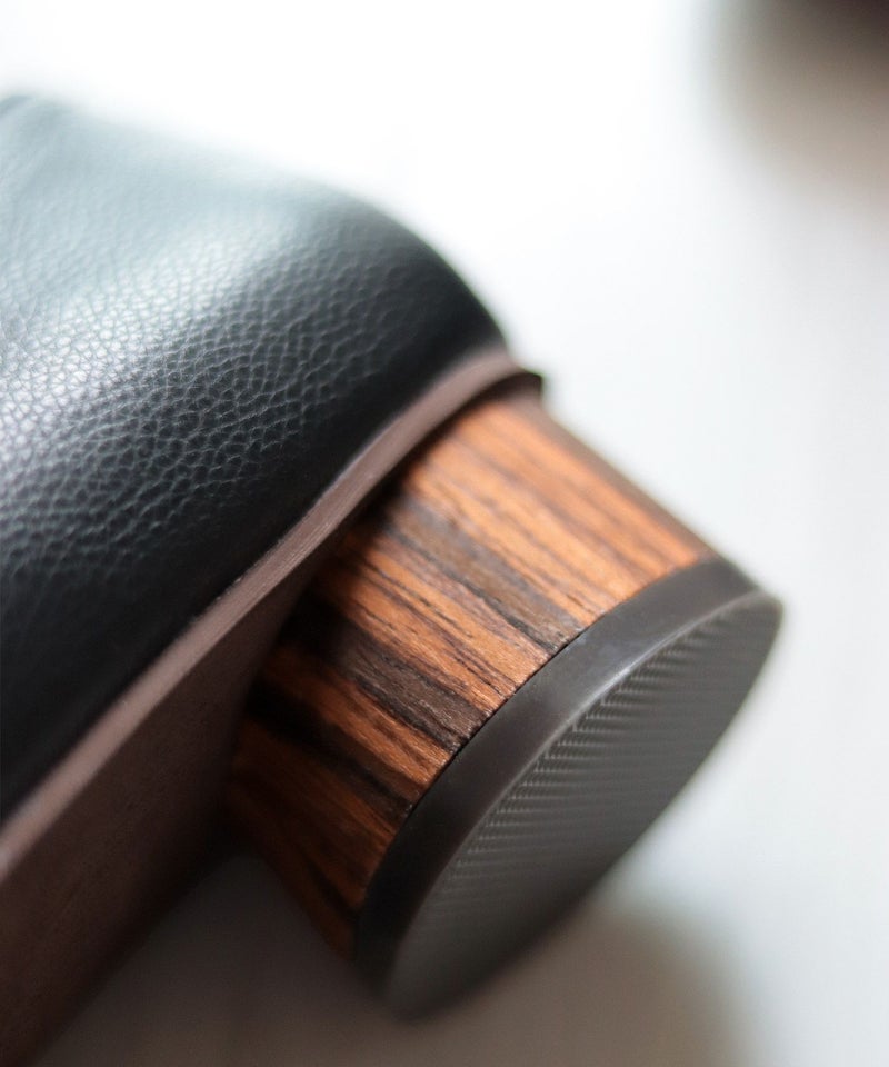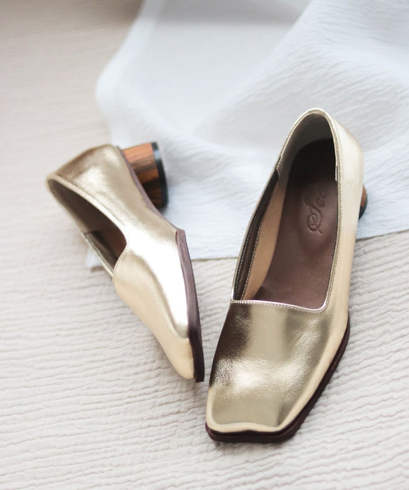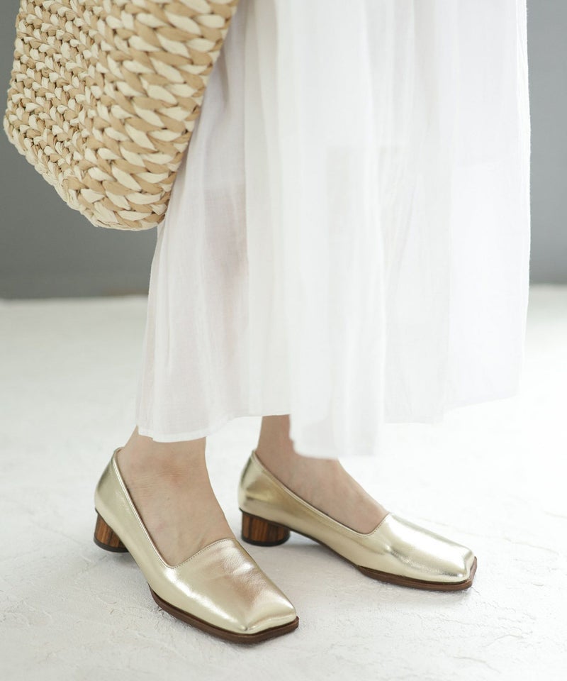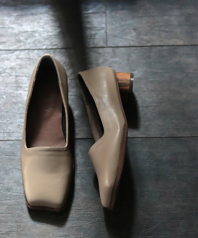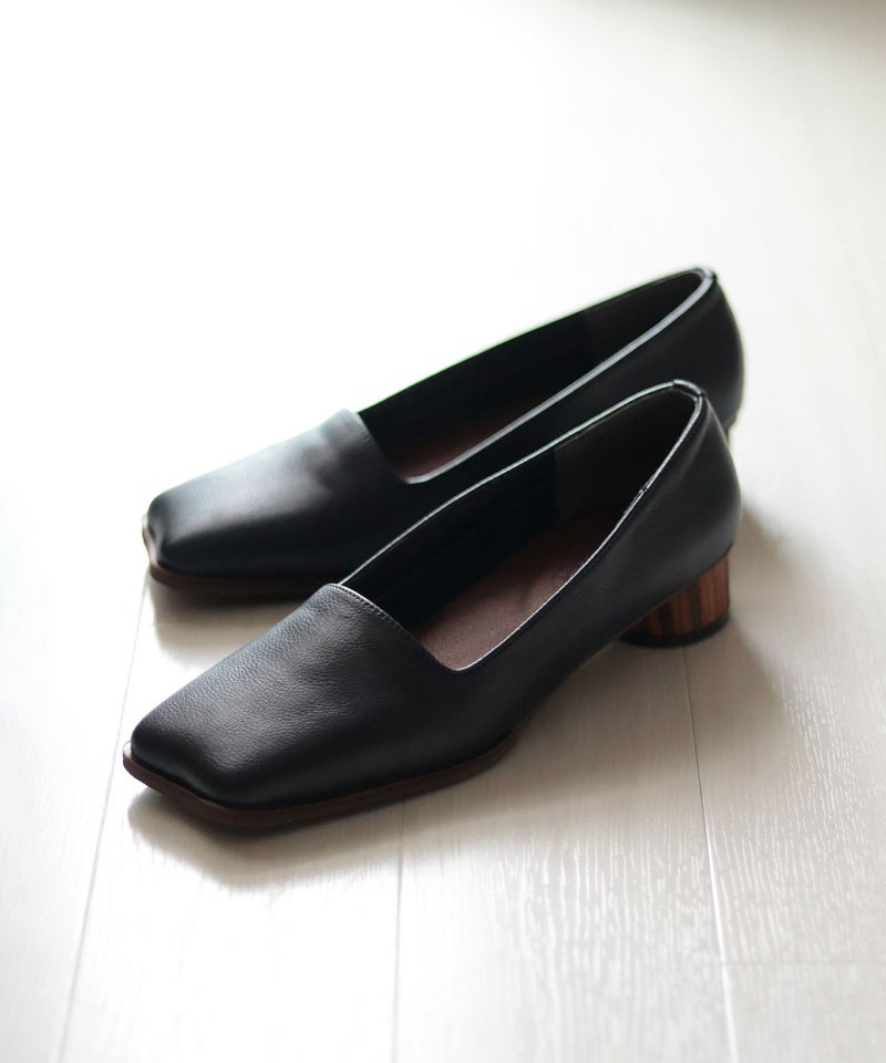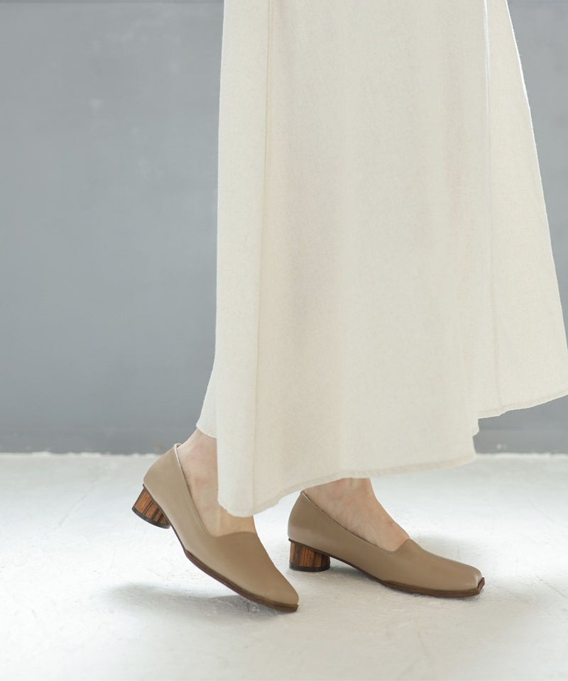 高級感のあるリアルウッドの素材を巻いたサークルヒールもポイント。