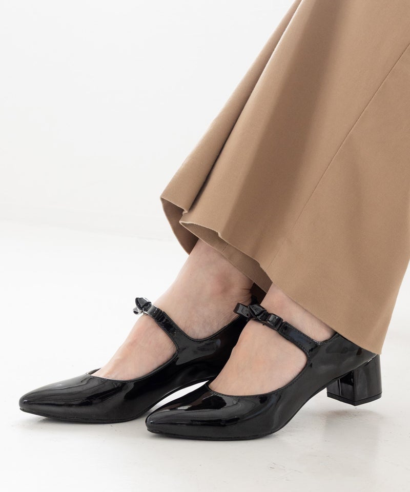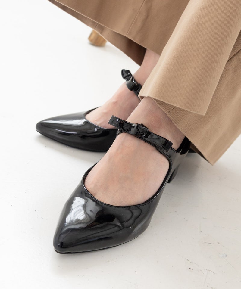 リボンストラップミドルヒールポインテッドトゥパンプス