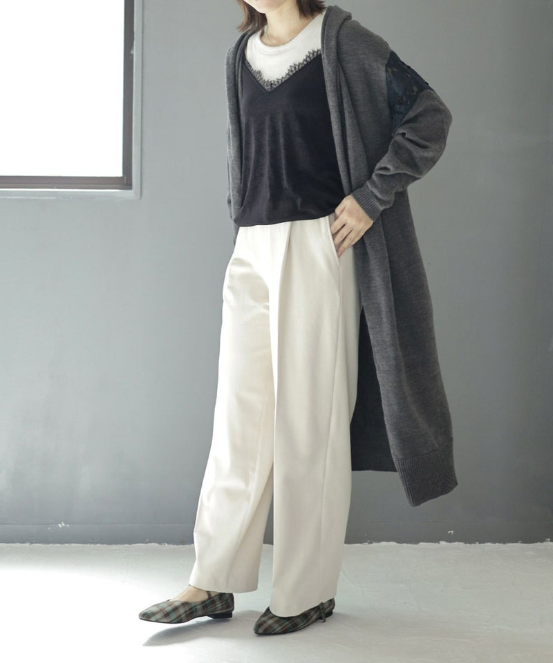 軽やかなスカートを大人っぽく導き、デニムパンツをほんのり可愛らしくしてくれる。