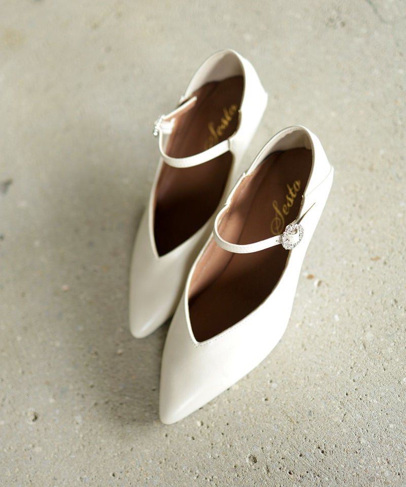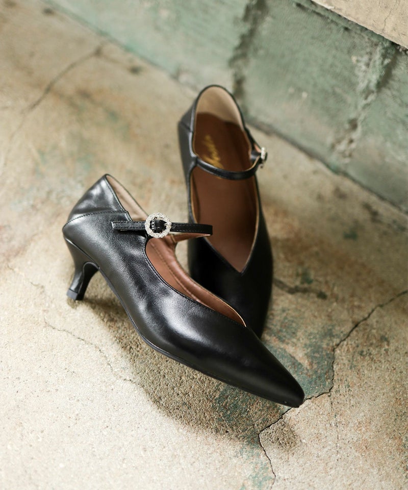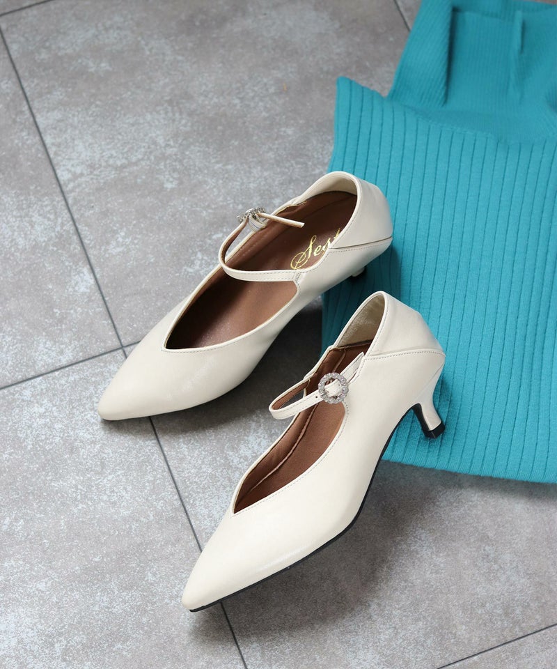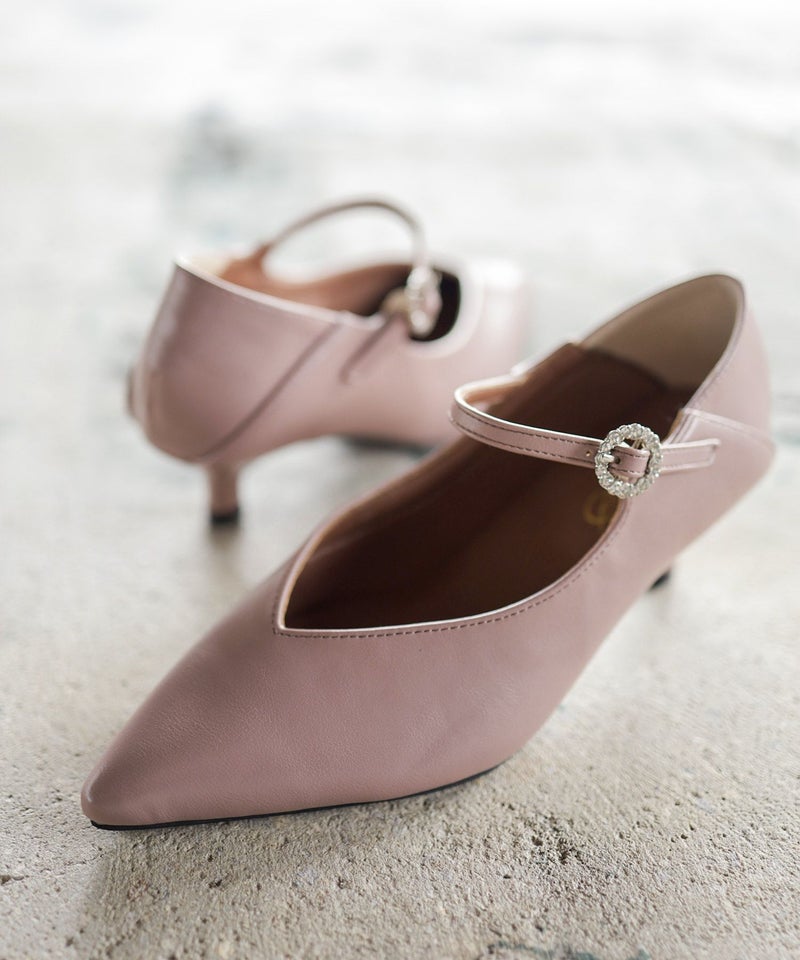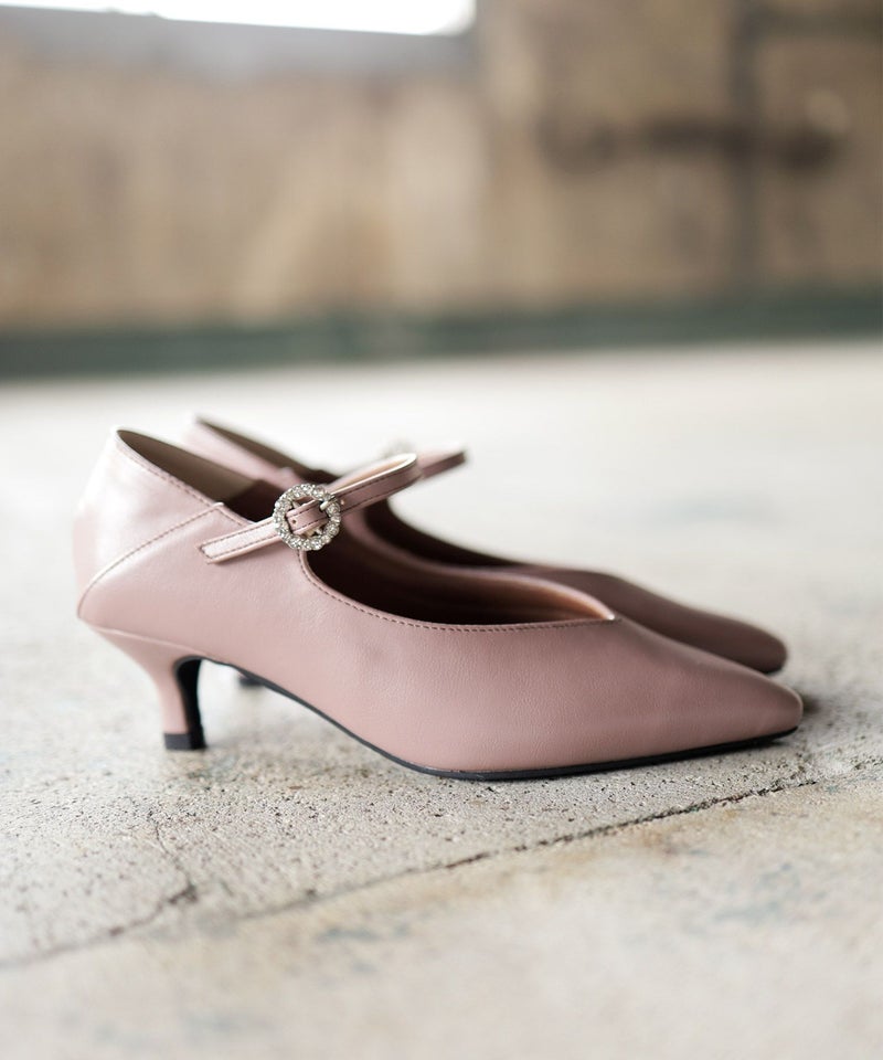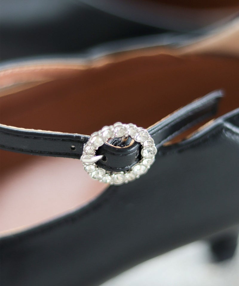 ストラップに施したビジュ-バックルが華やかさをプラスするメリージェーンパンプス。