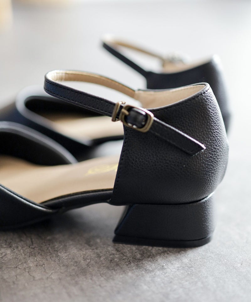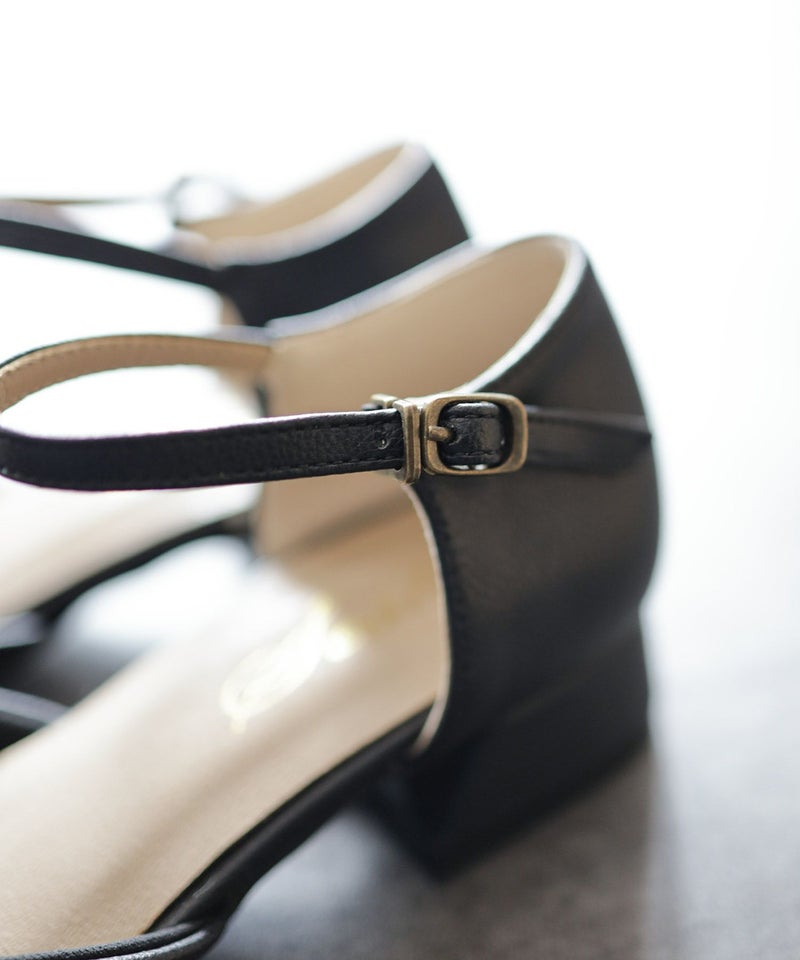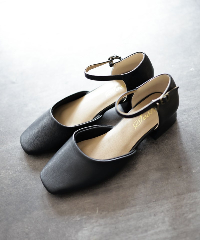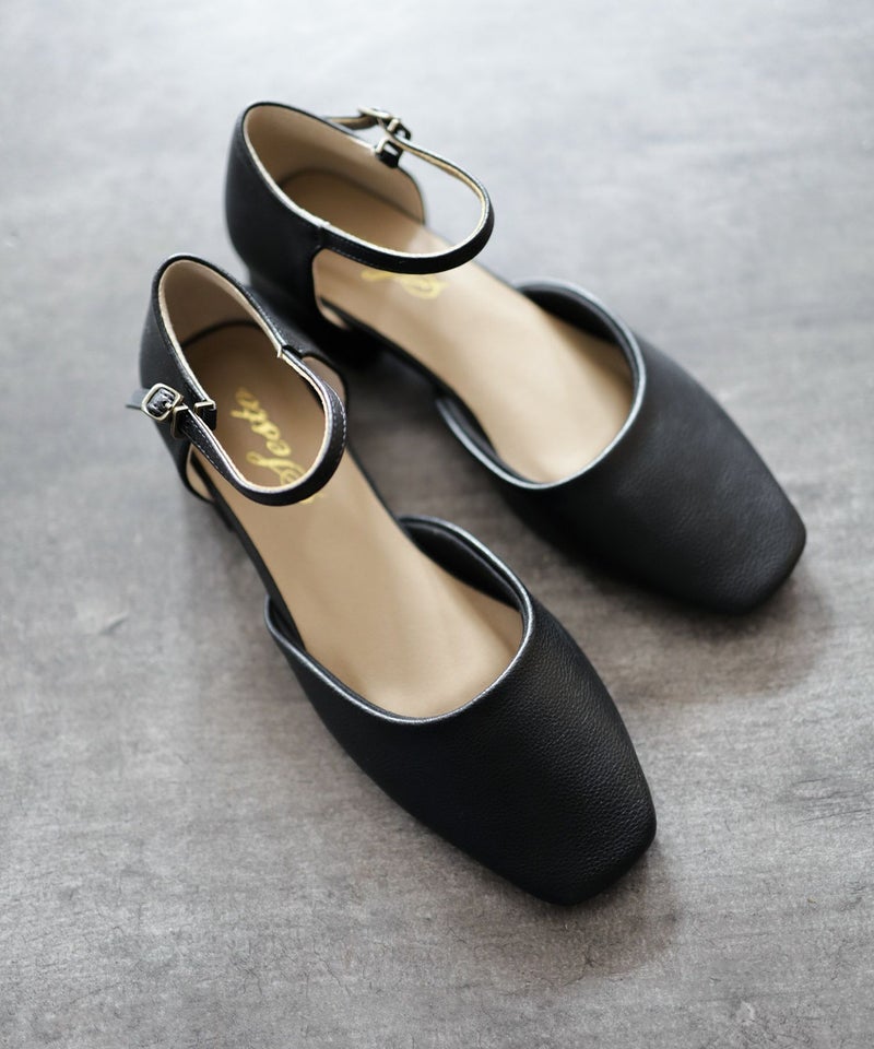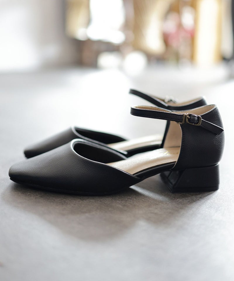 4. スクエアトゥアンクルストラップローヒールパンプス