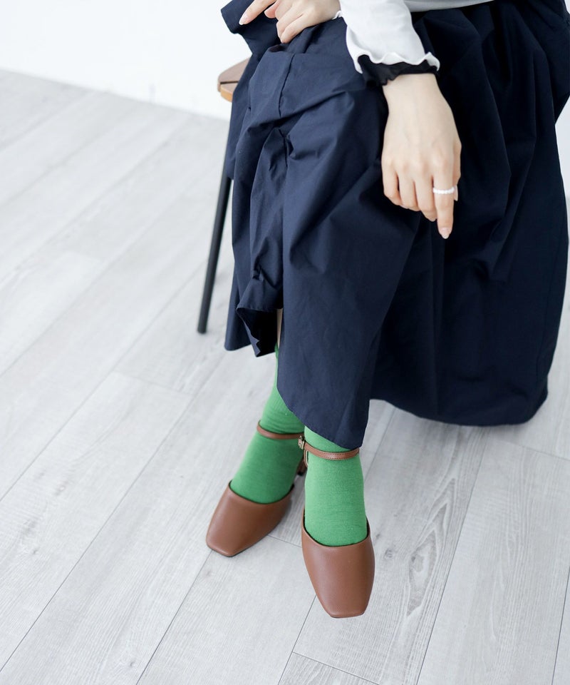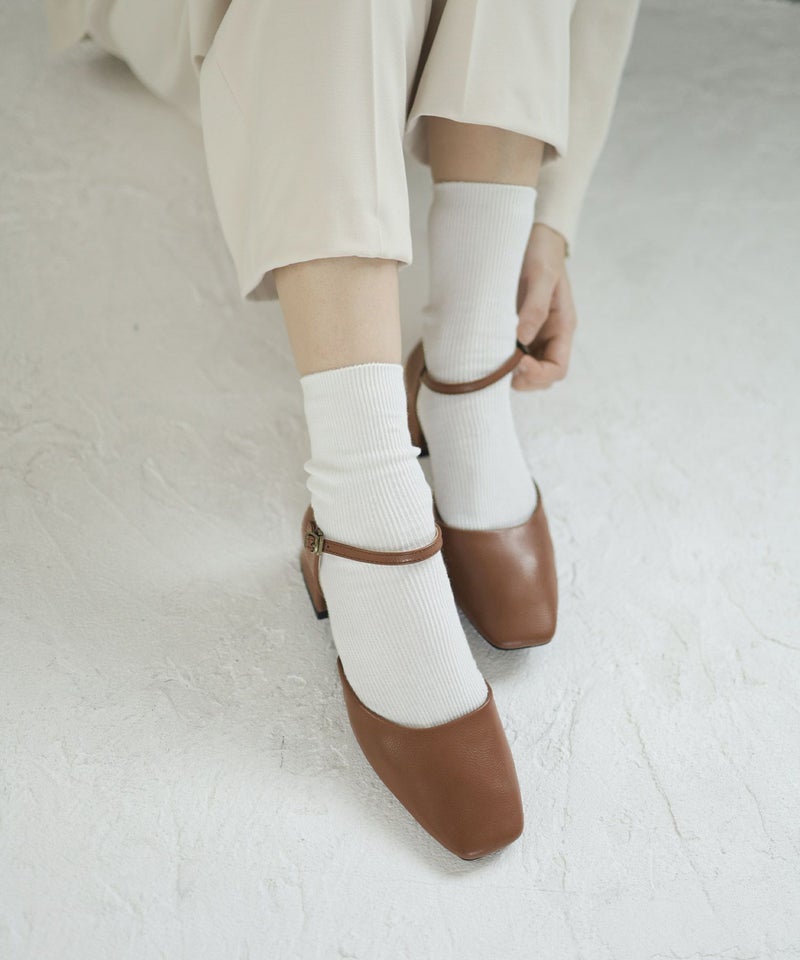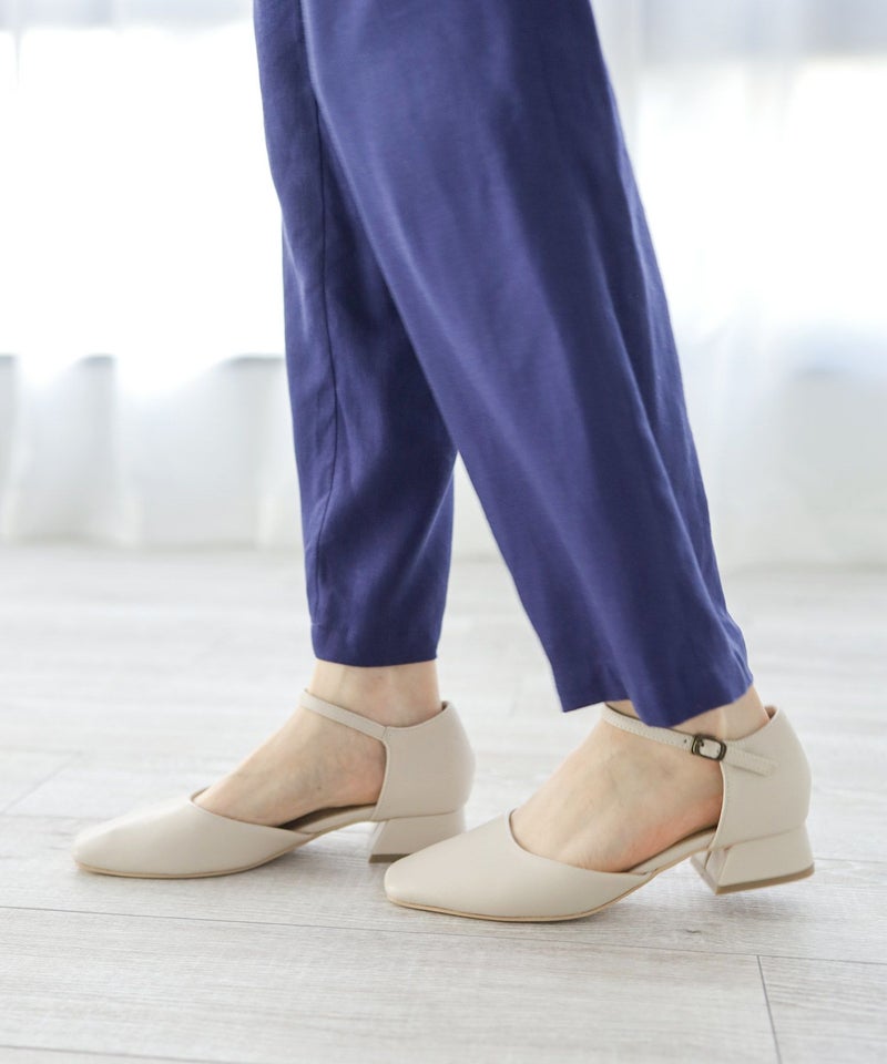 スクエアトゥアンクルストラップローヒールパンプス