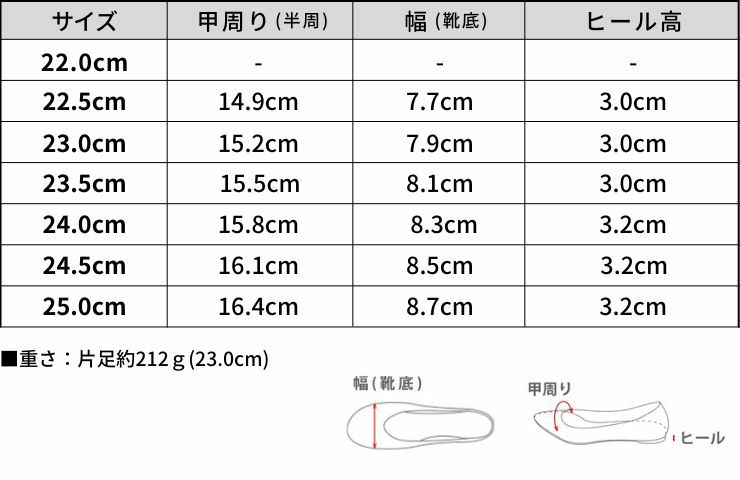 サイズ 甲周り(半周) 幅(靴底) ヒール高