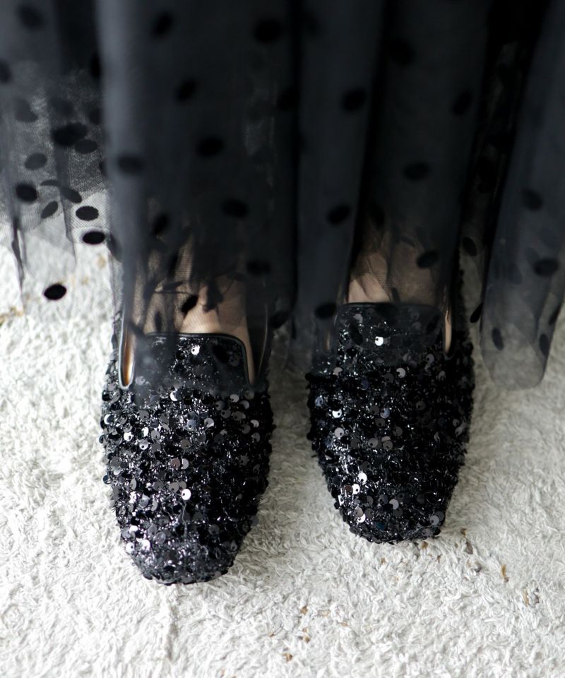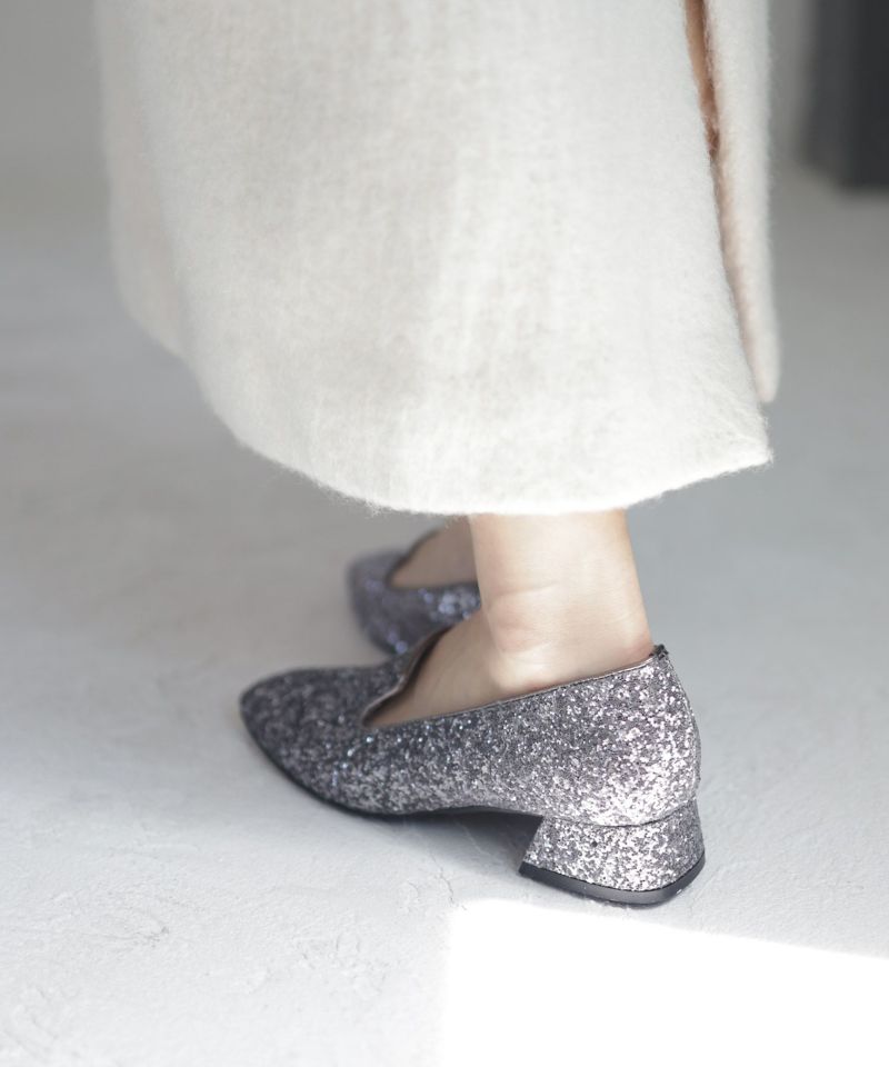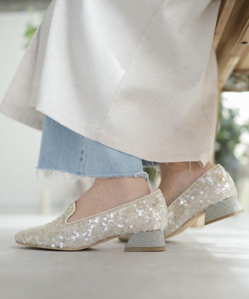 シンプルなフォルムにキラキラのグリッター&スパンコールで足元を華やかに彩るローファーパンプス。