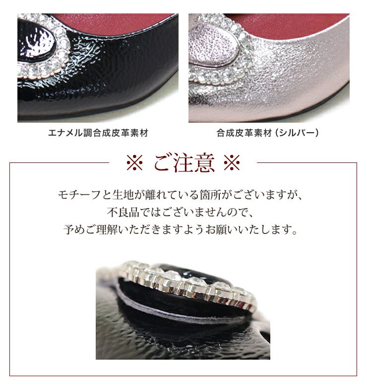 生産の過程にて接着面に多少のノリ汚れやキズ等がある場合がございます。汚れやキズの程度に関しましては弊社基準にて不良品かどうかの判断をさせていただいております。スエード調素材などの生地素材に関してはかかとやつま先部分にアタリ(生地がこすれたように多少白くなる現象)がみられる場合がございます。また毛足が長い素材等は多少色ムラを感じやすい場合がございます。エナメル調の素材に関しましては表面に薄っすらと曇りが生じる場合がございます。また商品によっては染料、接着剤などの匂いを感じるものがございます。お客様には大変恐縮ではございますが何卒ご理解賜りますようお願い申し上げます。
