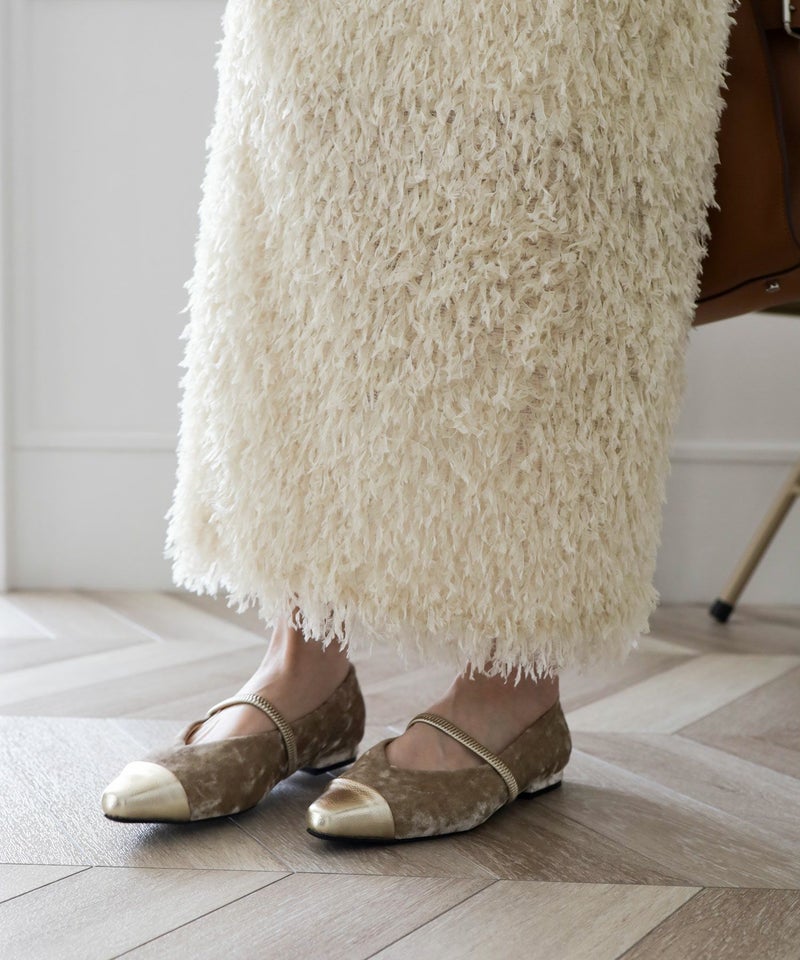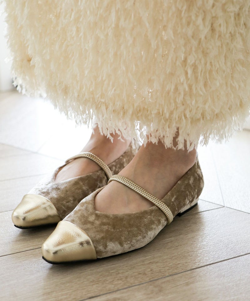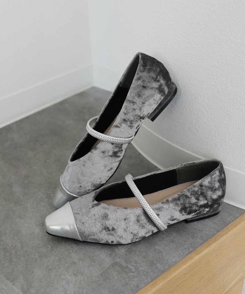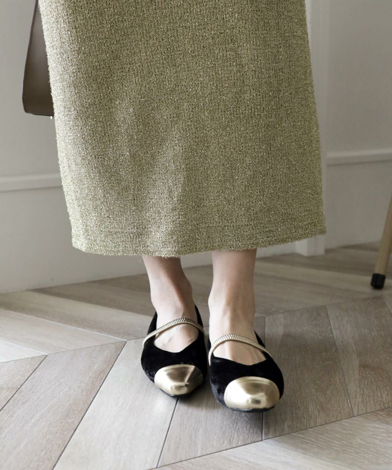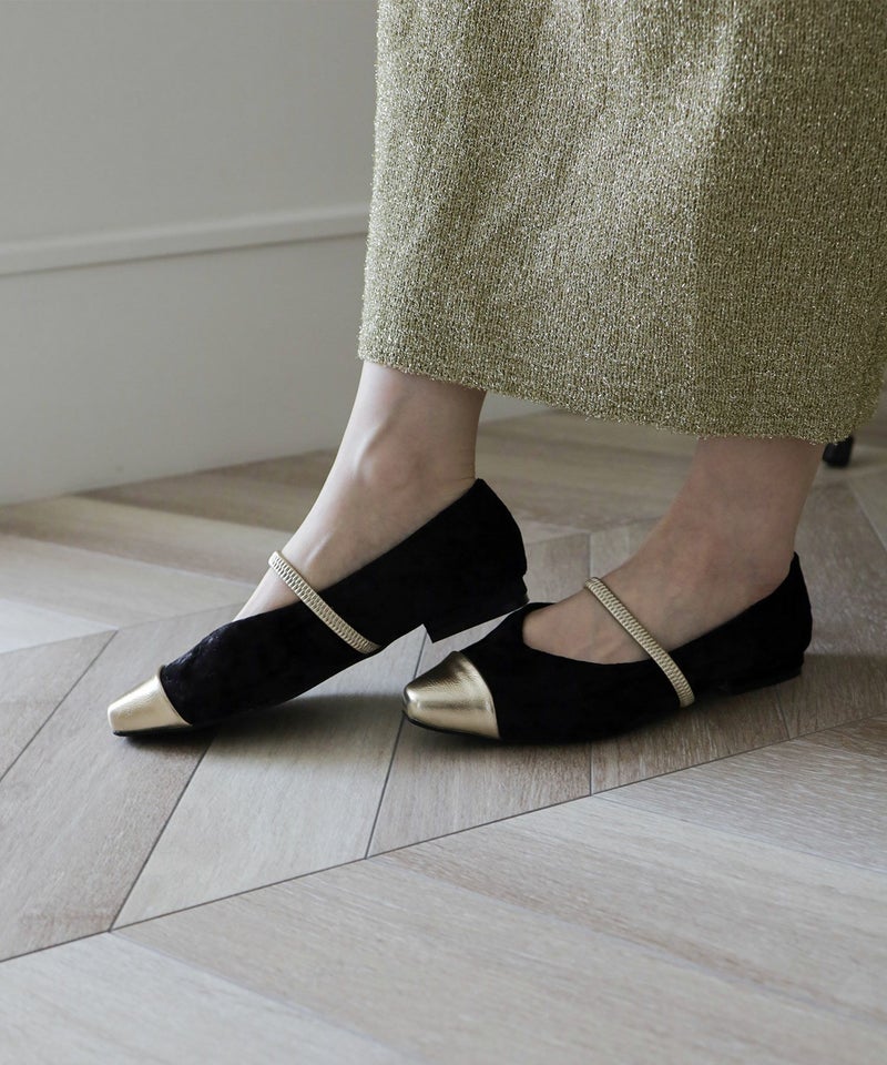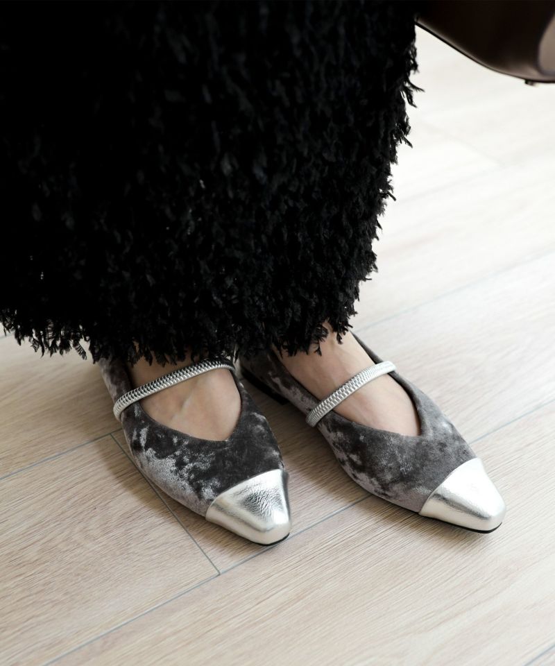 トゥとストラップ部分にはメタリックなレザー調素材をあしらいアクセントに。