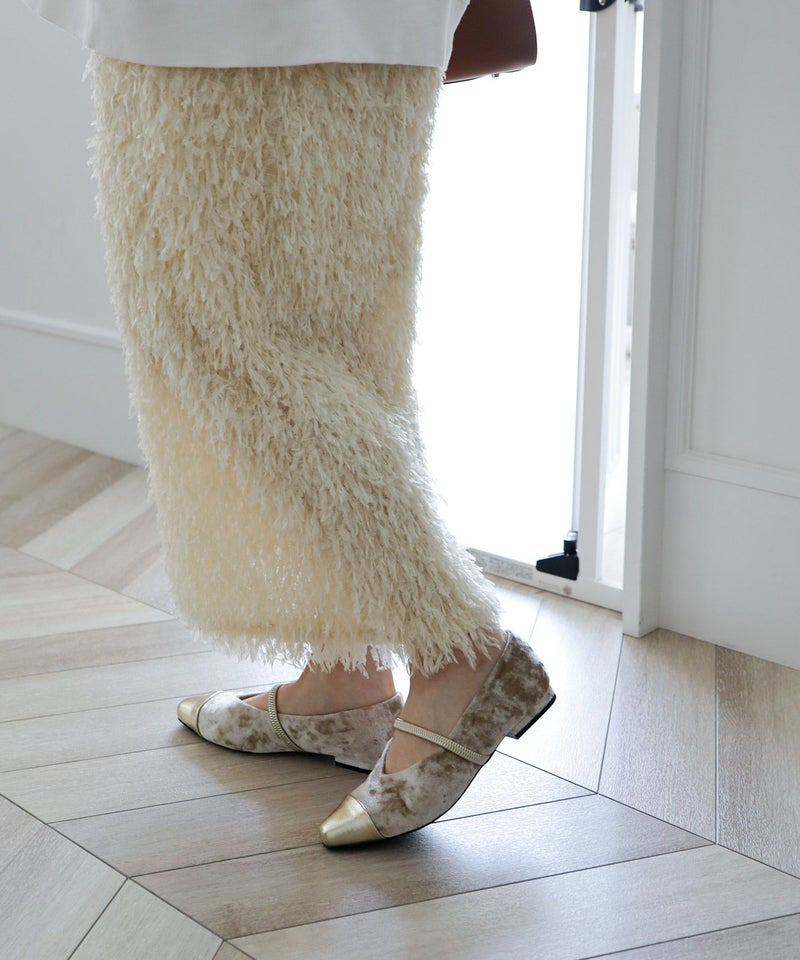 履き口はVカットに仕上げ、ローヒールでも足がすっきりと綺麗な印象に。