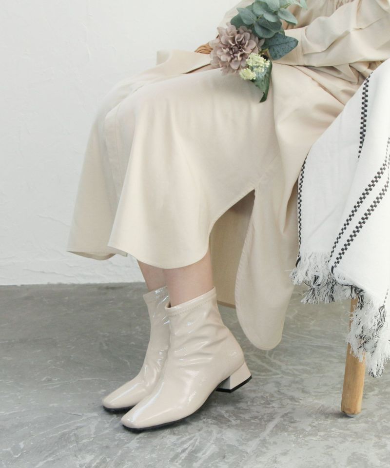 素材は柔らかいエナメル素材を使用、足に優しくフィットし雨の日じゃなくてもストレッチブーツとしてオシャレに履いていただけます。