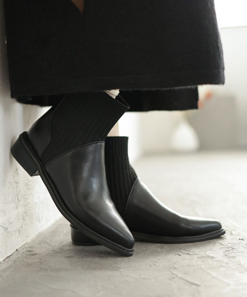 全体はツヤ感のある上質なレザー調素材、甲の上から履き口にかけてはニット生地で柔らかい足当たりに。