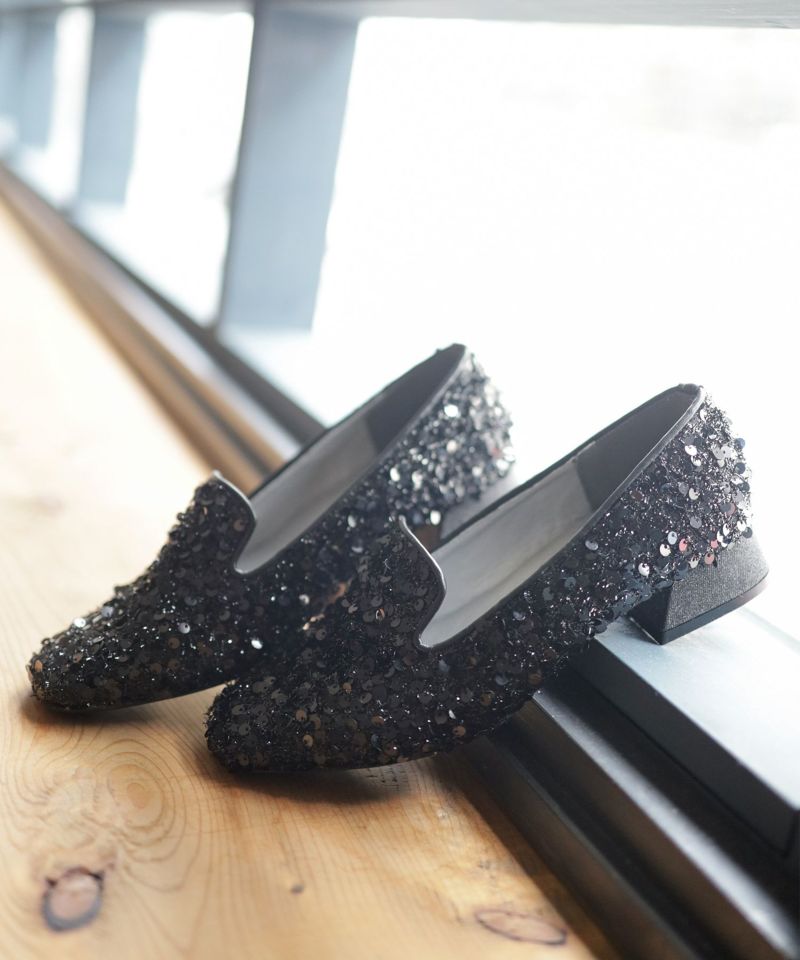 シンプルなフォルムにキラキラのグリッター&スパンコールで足元を華やかに彩るローファーパンプス。