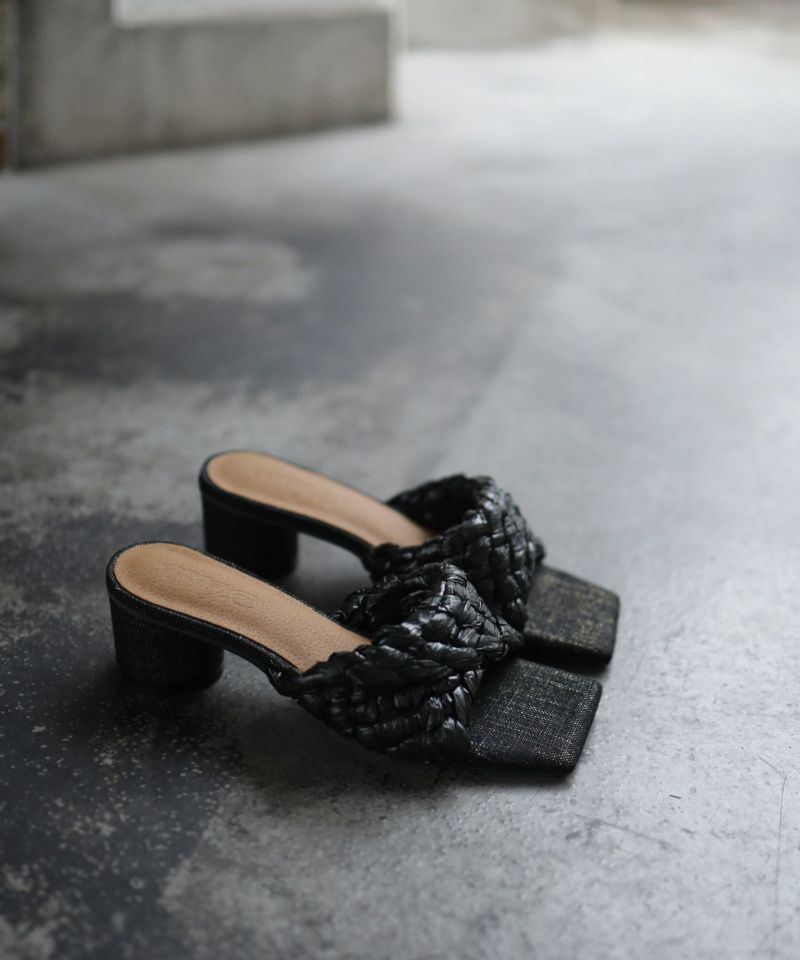 編み込みデザインサークルヒールミュールサンダル▲返品不可