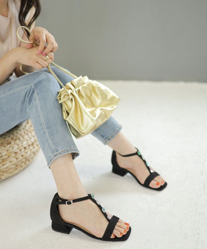 4. カラービジューTストラップローヒールサンダル▲返品交換不可