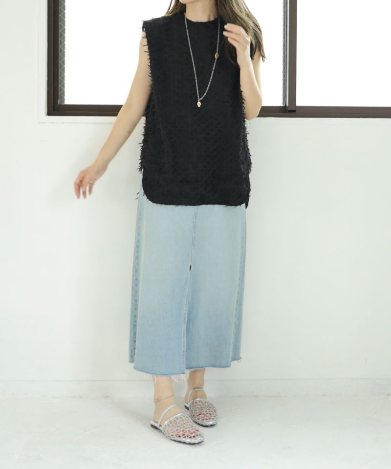 シンプルなフォルムでもメッシュの素材感で遊び心を忘れず、華奢で女性らしいスタイリングが完成します。