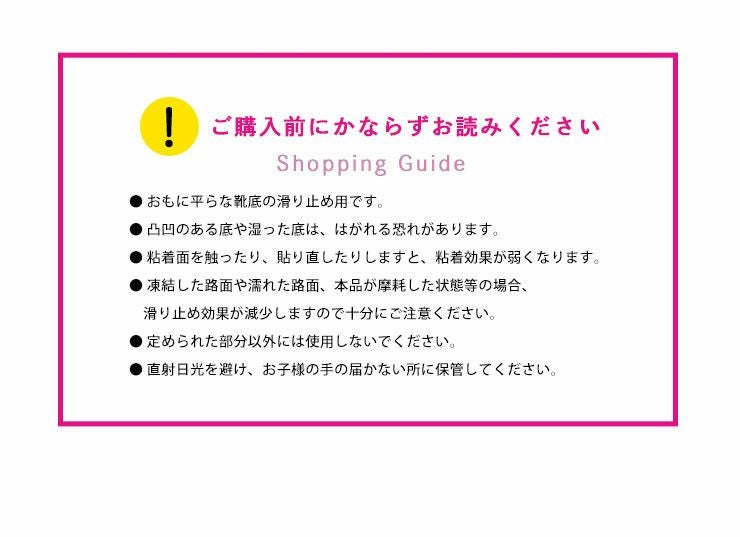 商品説明靴底に貼るだけで、お手持ちの靴の滑りを防止してくれるアイテム。