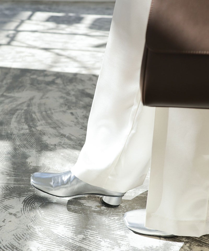 トレンドの細長いスクエアトゥは知的で品のある雰囲気に仕上げます。