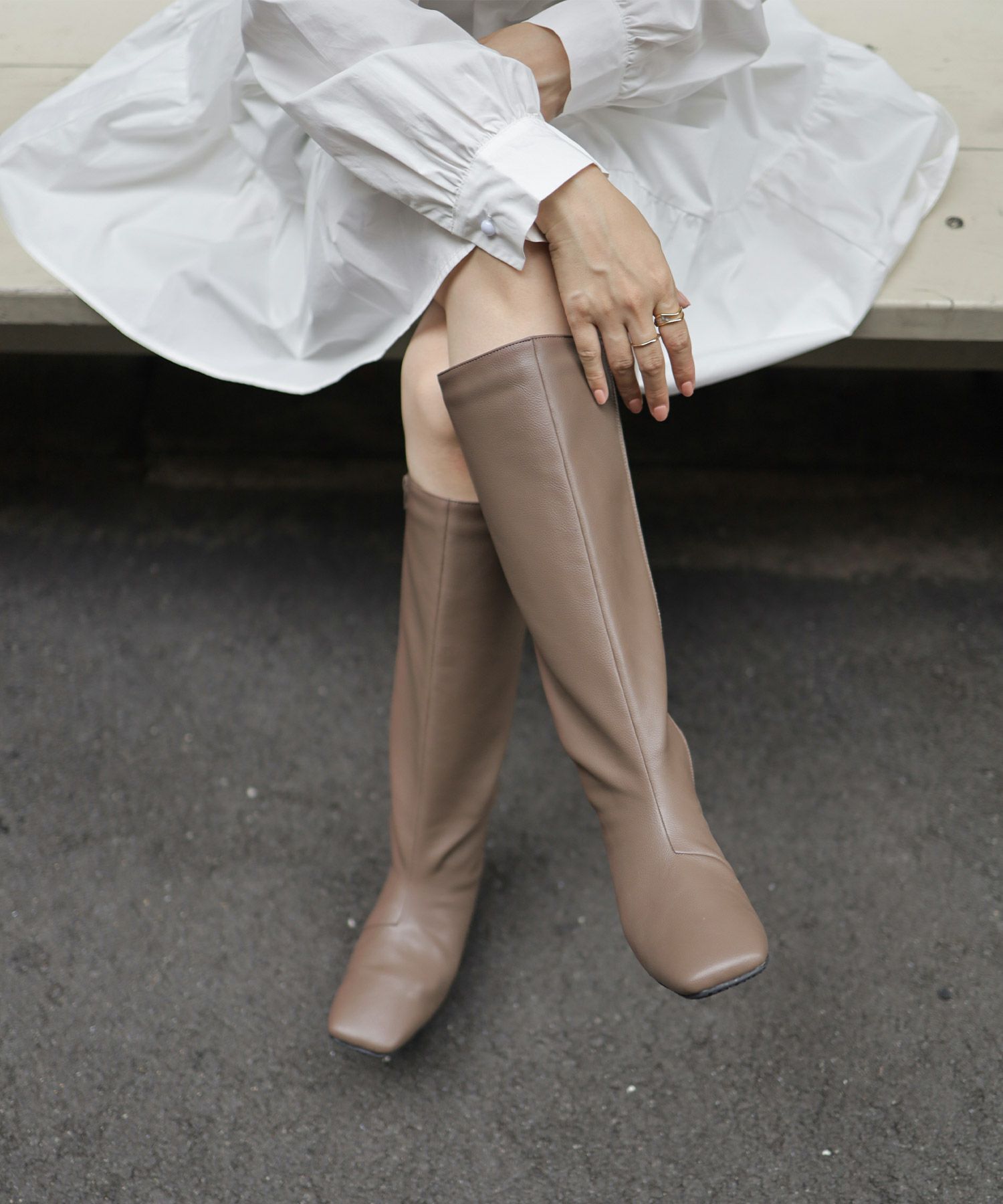 装飾のないミニマルなルックスの「ローヒールロングブーツ」。