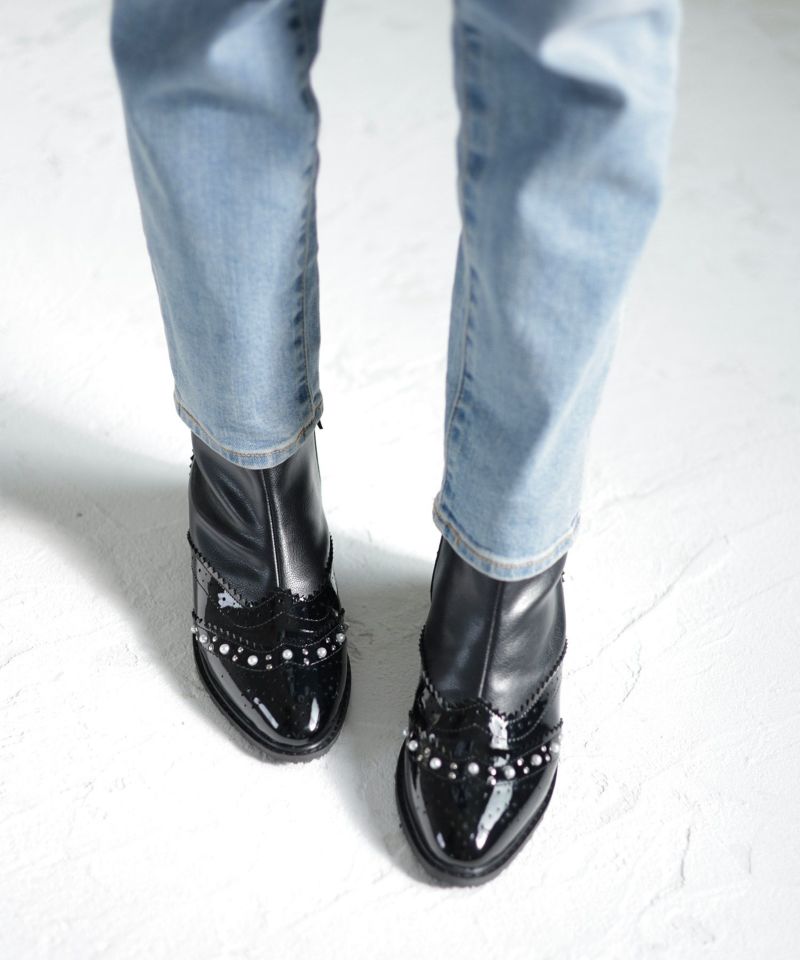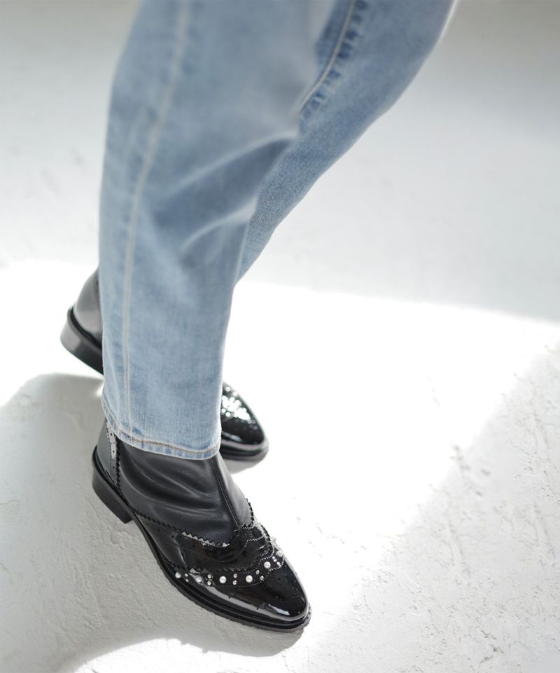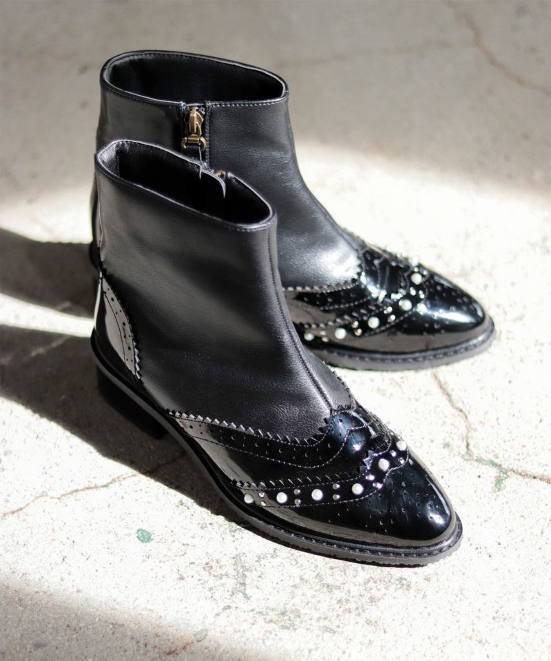 異素材MIXが表情豊かなパール×ウイングチップショートブーツの登場です。