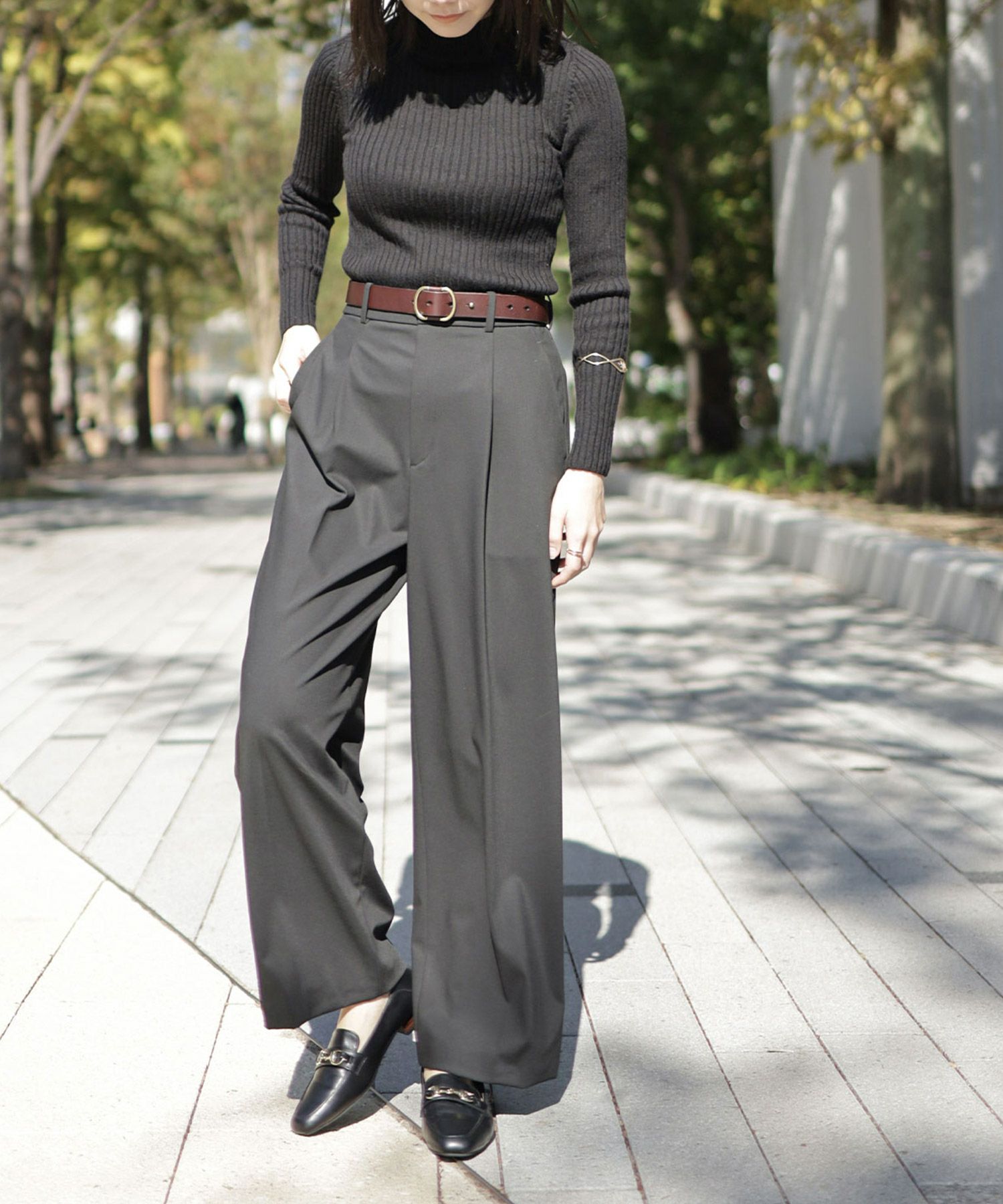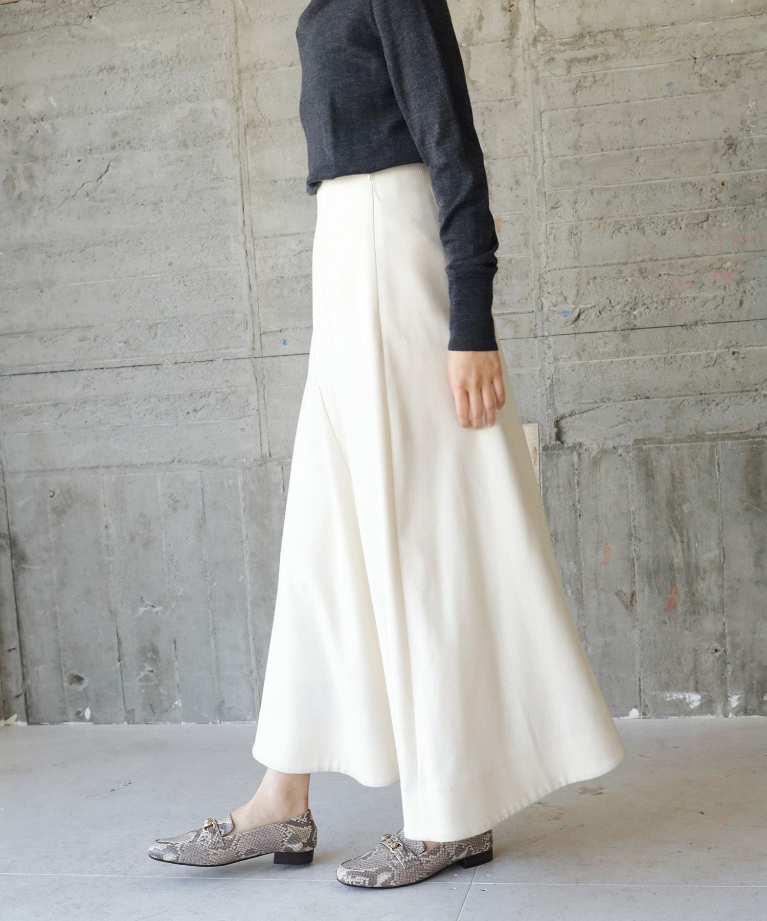 マニッシュな印象のローファーでもシルエットでエレガントさや女性らしさを演出。