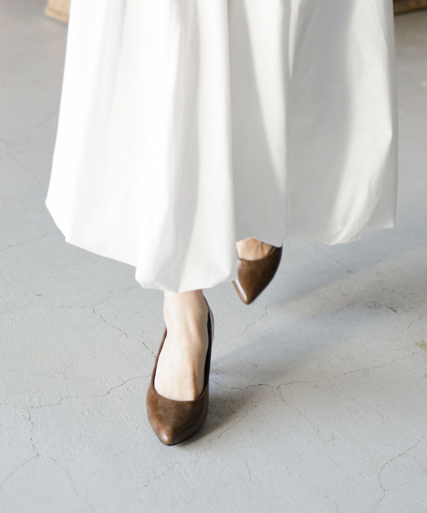 足がきれいに見えるシャープなシルエットはそのままに、トゥに厚みをつけて中の体積をアップさせることで窮屈さを軽減したポインテッドトゥに仕上げました。