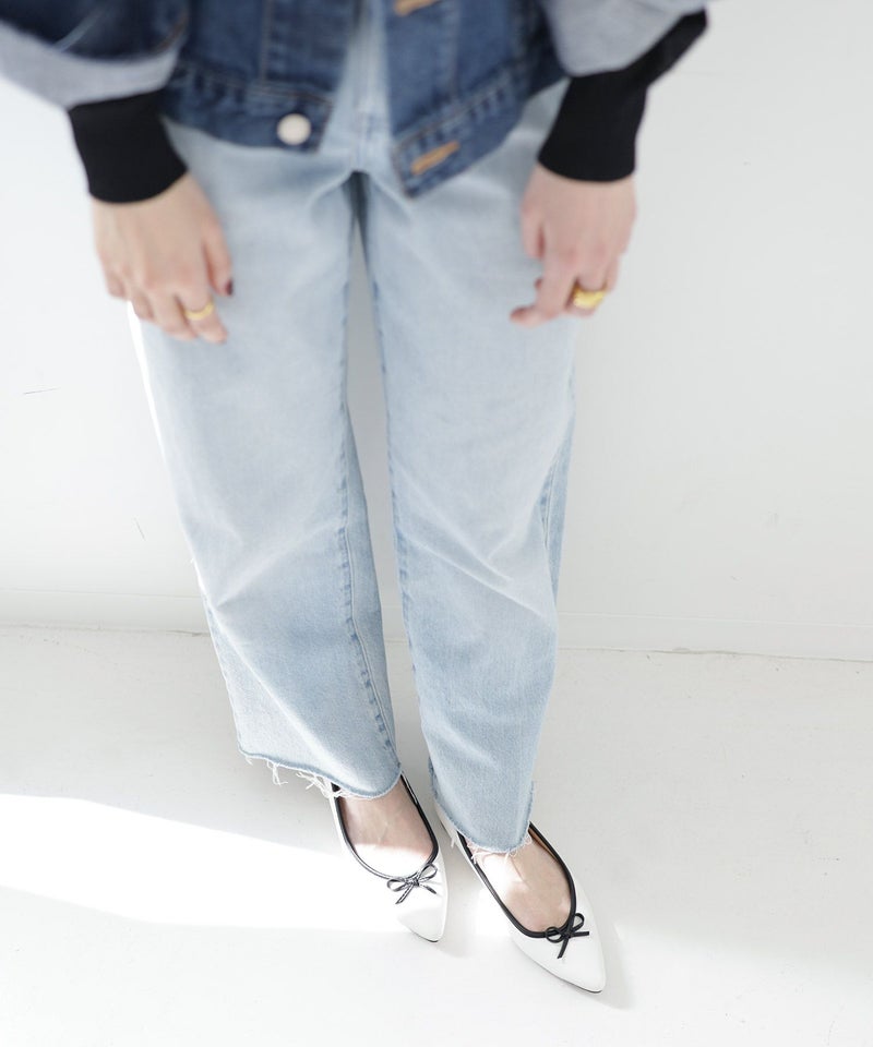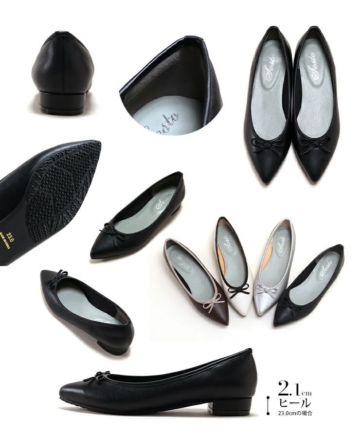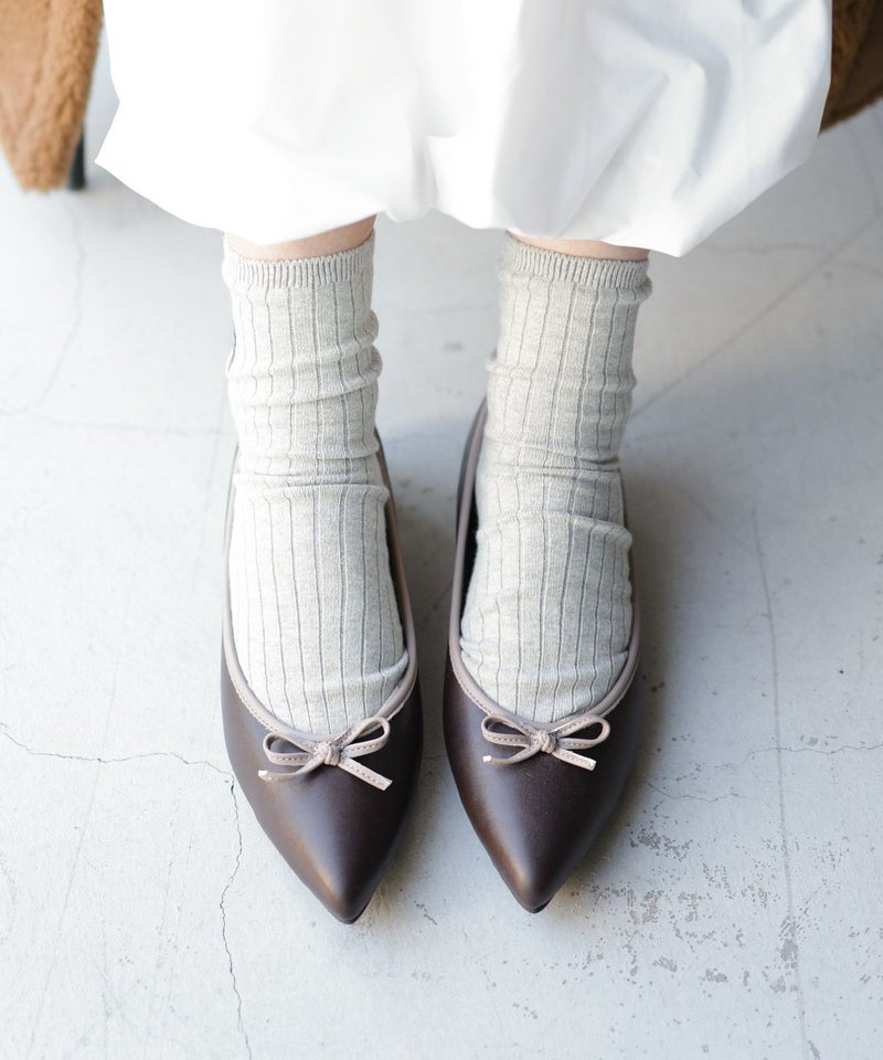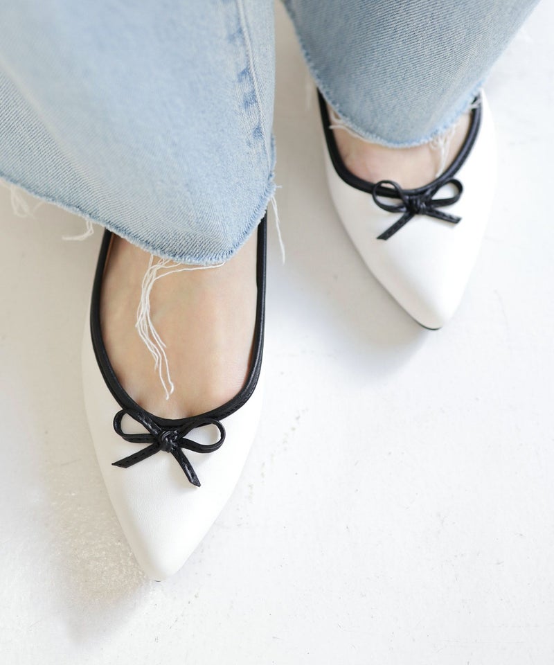 つま先をきちんと感のあるポインテットトゥのデザインにすることでローヒールでも華奢で美しい足元をつくります。