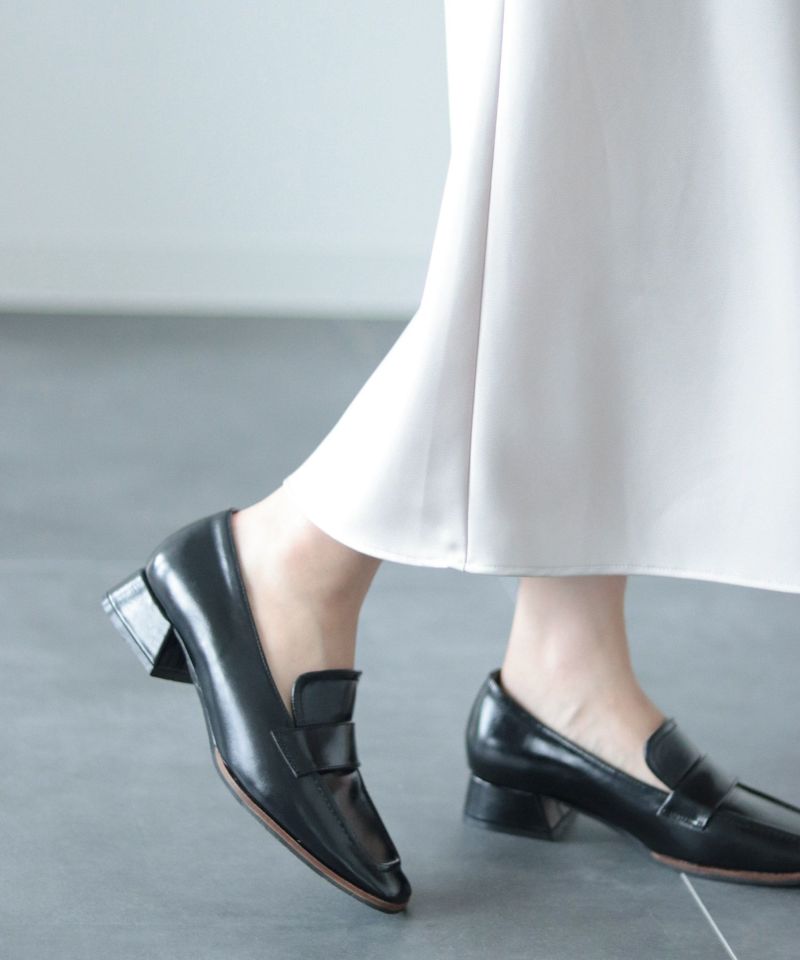 【POINT1】トラッド感のあるローファーに、スリムなスクエアトゥとヒールを組み合わせることで、上品さとエレガントさを兼ね備えたデザインに仕上げています。甲深でシンプルなデザインがトレンド感を漂わせ、着こなしを大人っぽくアップデートしてくれます。
