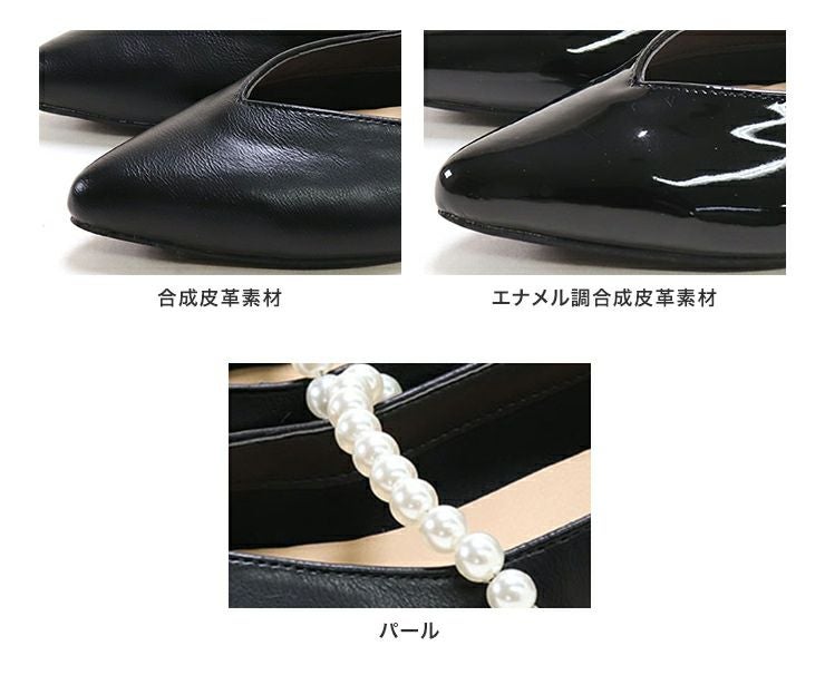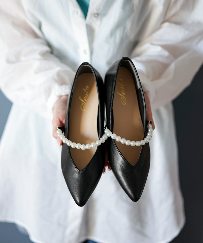 パールストラップのポインテッドトゥローヒールメリージェーンパンプス▲返品交換不可