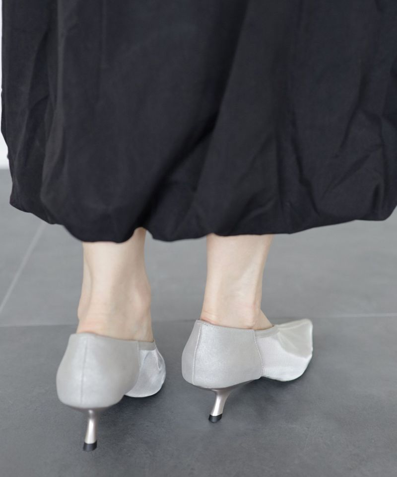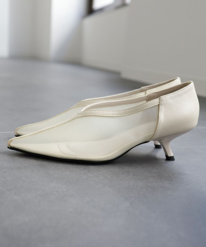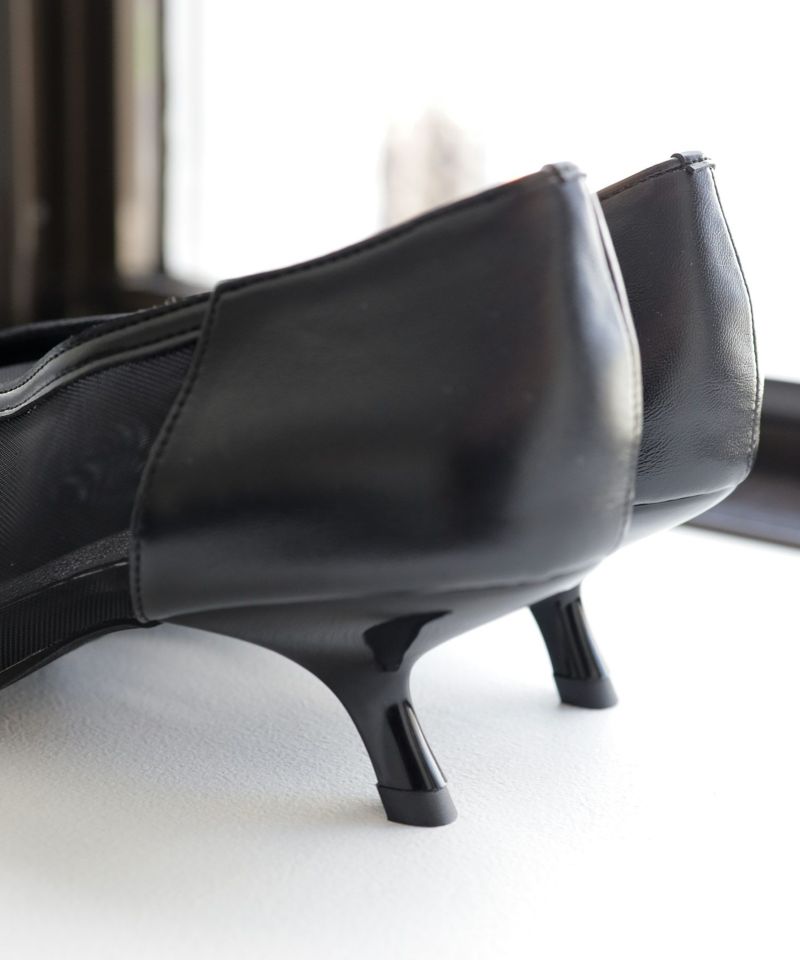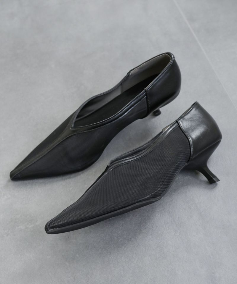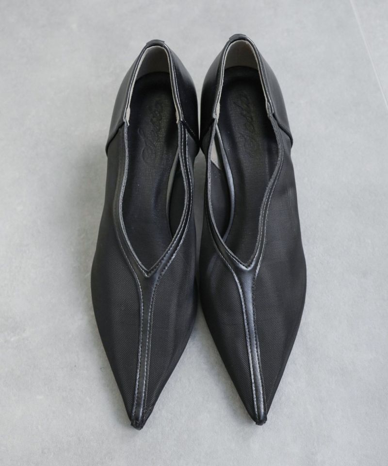 すらっと伸びるポインテッドトゥは美脚効果抜群。柔らかいメッシュ素材なので先端が細くても圧迫感はありません。幅広さんもOK。センターシームデザインVカットの履き口も足がきれいに見えるポイントです。