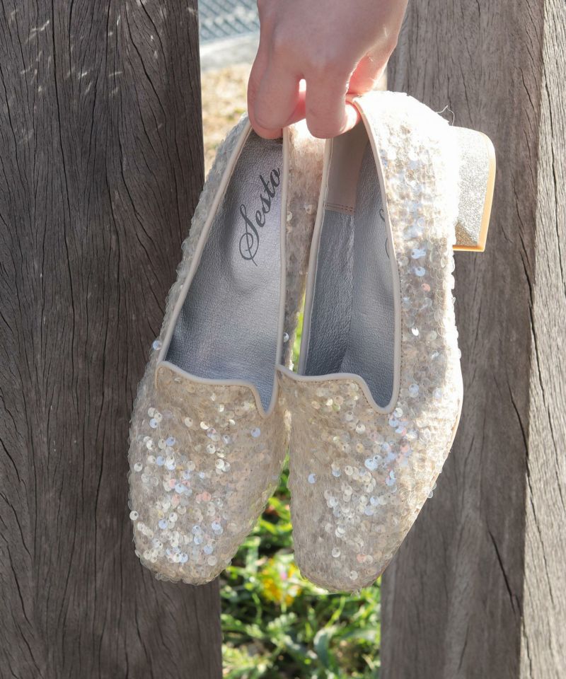 シンプルなフォルムにキラキラのグリッター&スパンコールで足元を華やかに彩るローファーパンプス。