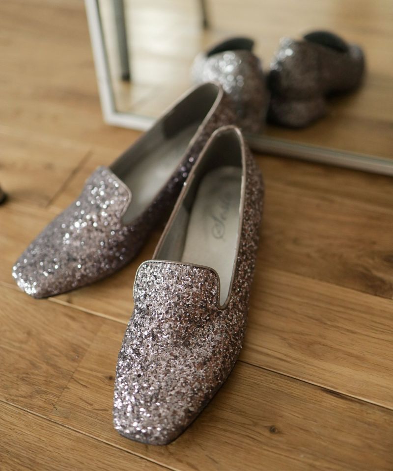 シンプルなフォルムにキラキラのグリッター&スパンコールで足元を華やかに彩るローファーパンプス。