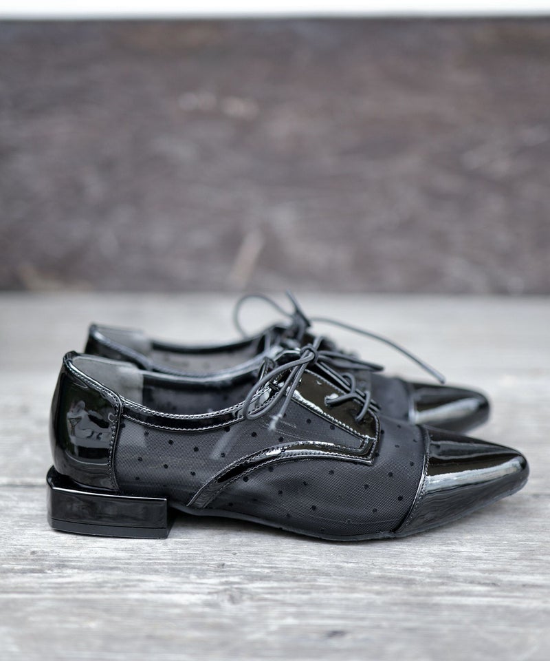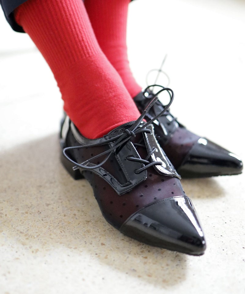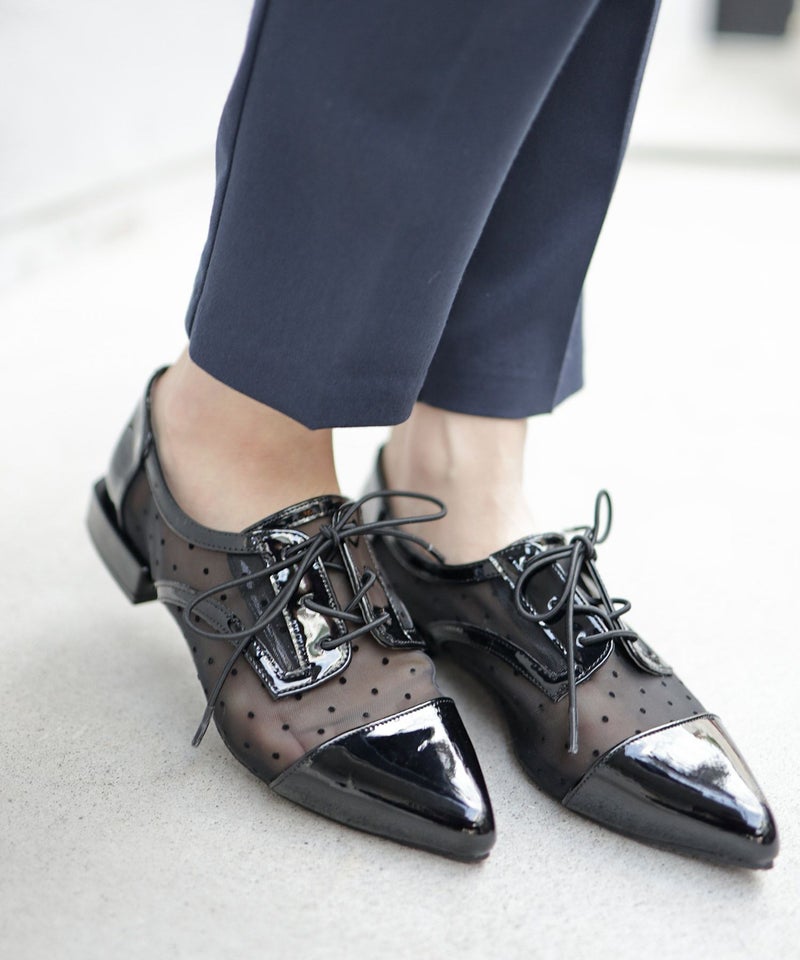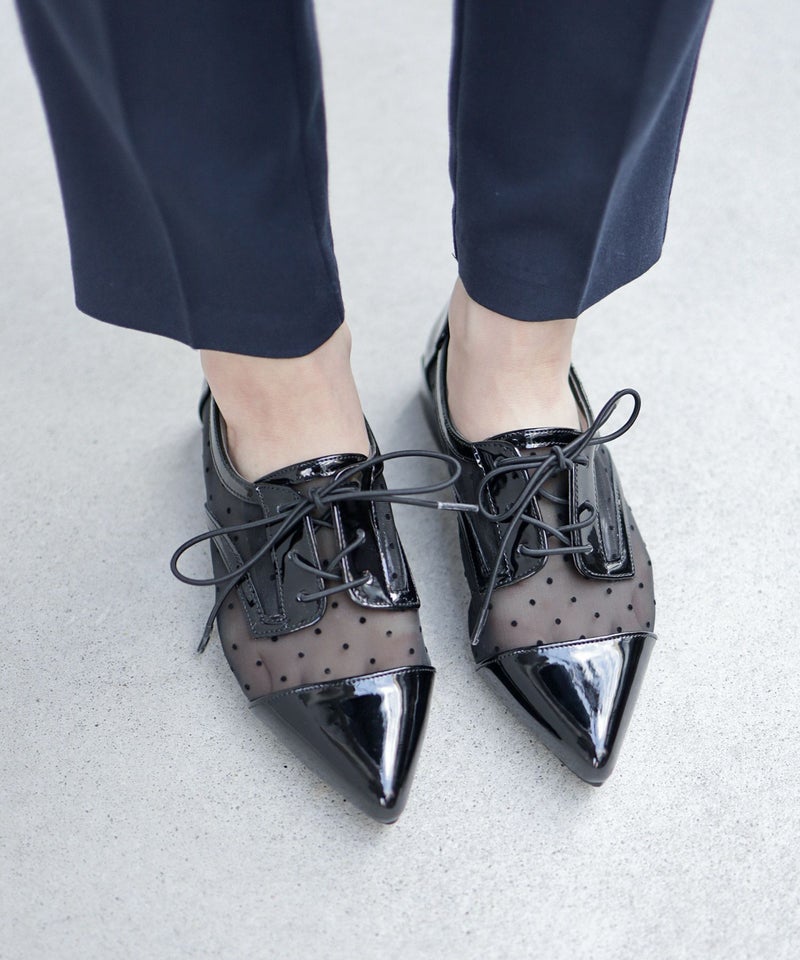今季注目のマニッシュシューズに品あるドットチュールで甘さをプラス。