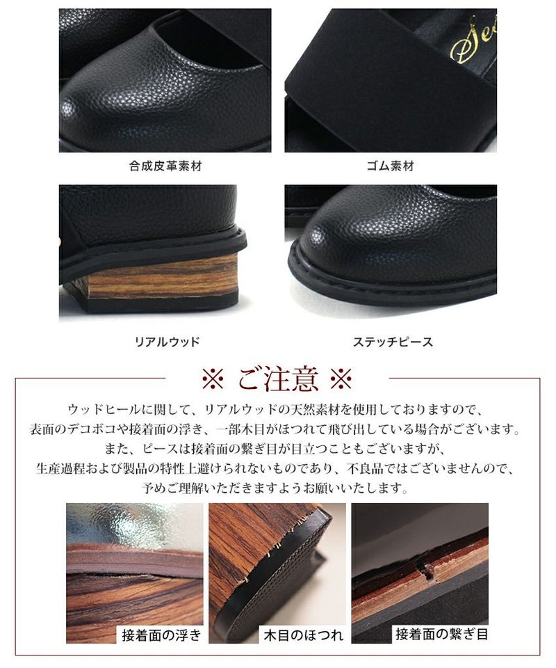 生産の過程にて接着面に多少のノリ汚れやキズ等がある場合がございます。汚れやキズの程度に関しましては弊社基準にて不良品かどうかの判断をさせていただいております。スエード調素材などの生地素材に関してはかかとやつま先部分にアタリ(生地がこすれたように多少白くなる現象)がみられる場合がございます。また毛足が長い素材等は多少色ムラを感じやすい場合がございます。エナメル調の素材に関しましては表面に薄っすらと曇りが生じる場合がございます。また商品によっては染料、接着剤などの匂いを感じるものがございます。お客様には大変恐縮ではございますが何卒ご理解賜りますようお願い申し上げます。
