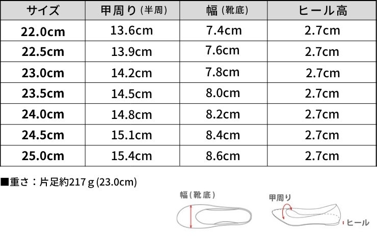 サイズ 甲周り(半周) 幅(靴底) ヒール高
