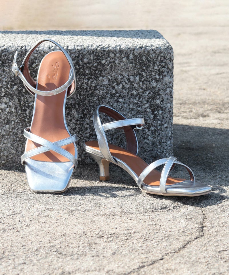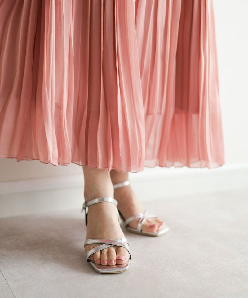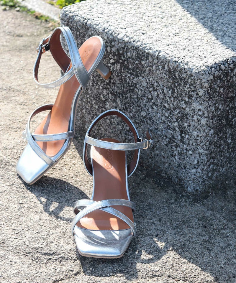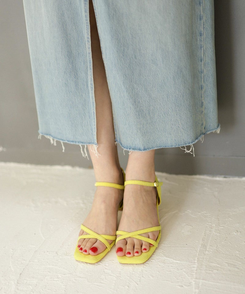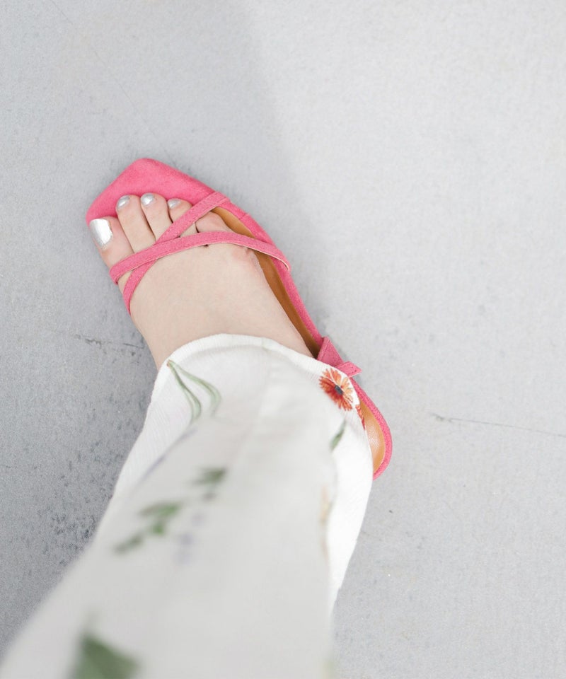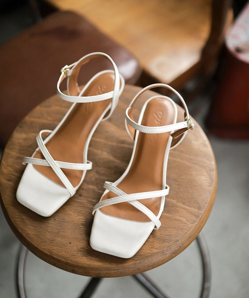 キトゥンヒールに、アッパーの細身なクロスストラップなど華奢なディテールが女性らしいヌーディーな足元へと導き、スタイリングに抜け感を与えてくれます。
