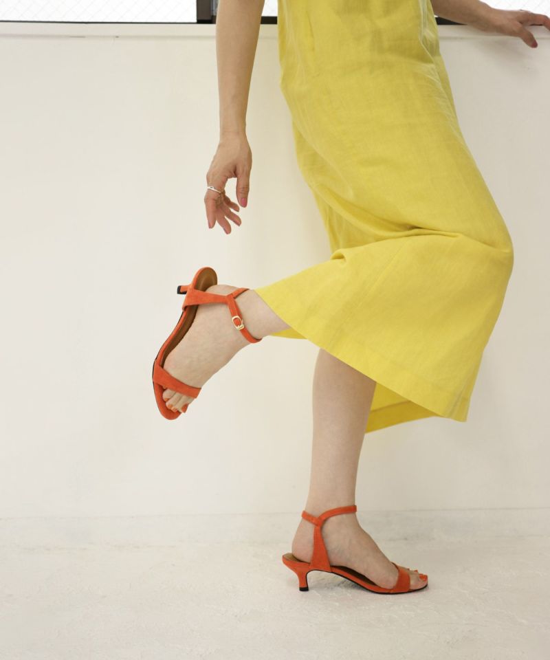 アンクルストラップは高さを出したことで、約5cmのミドルヒールでもスッキリとした印象に。