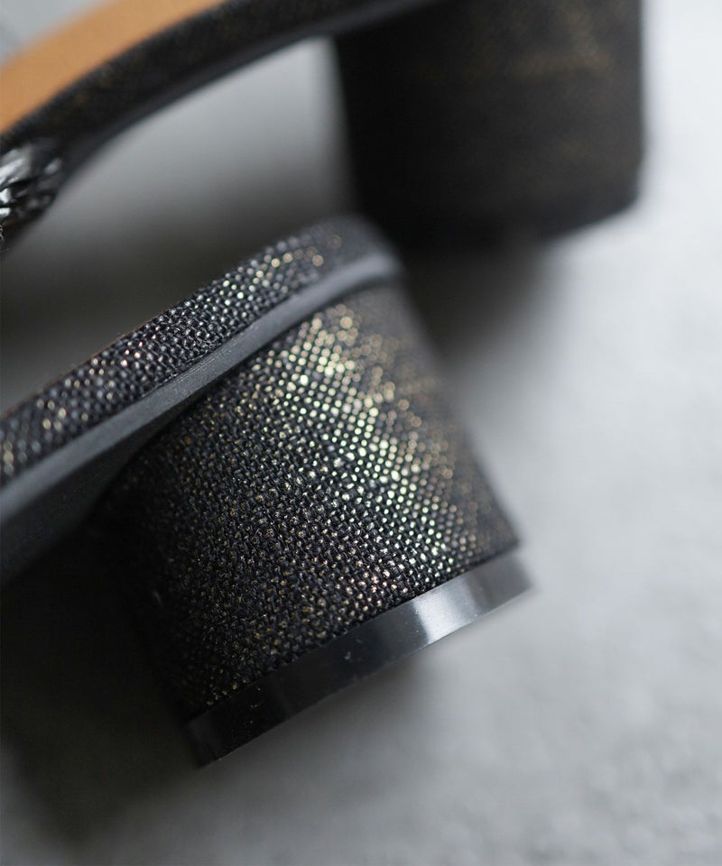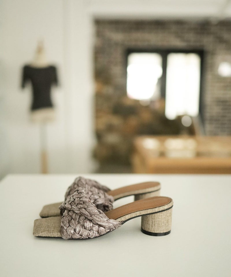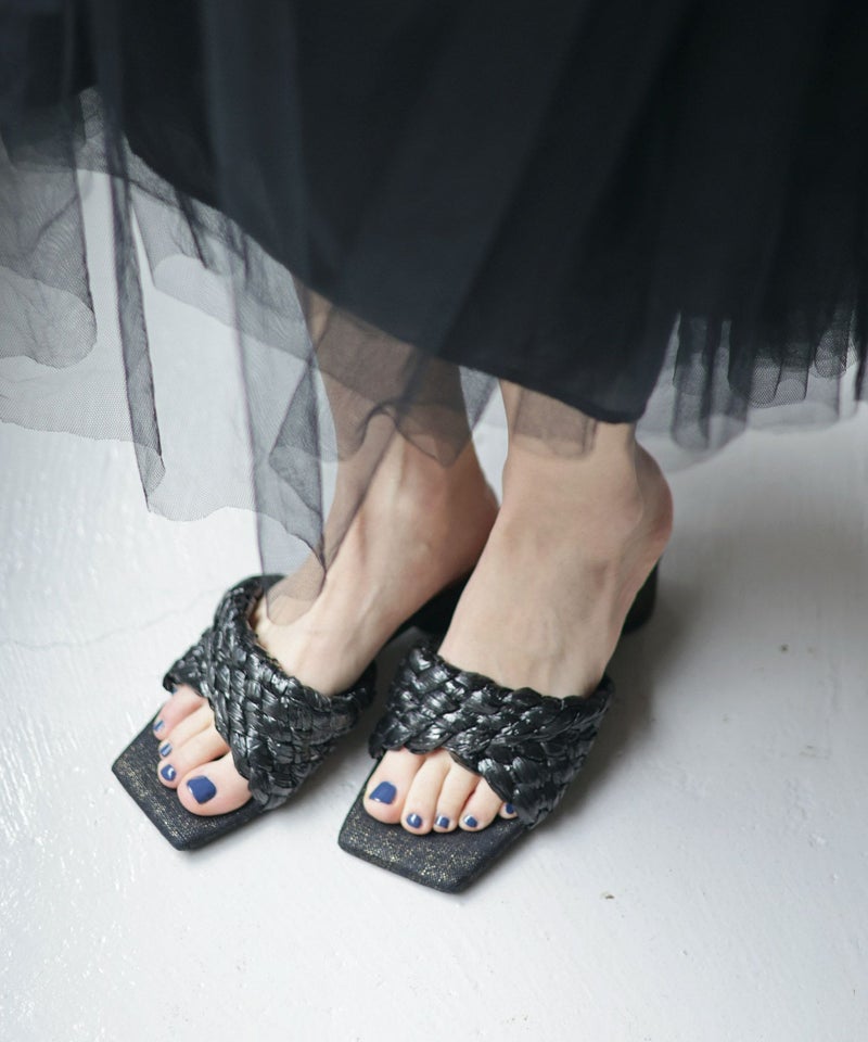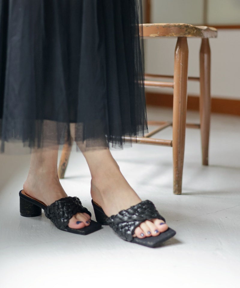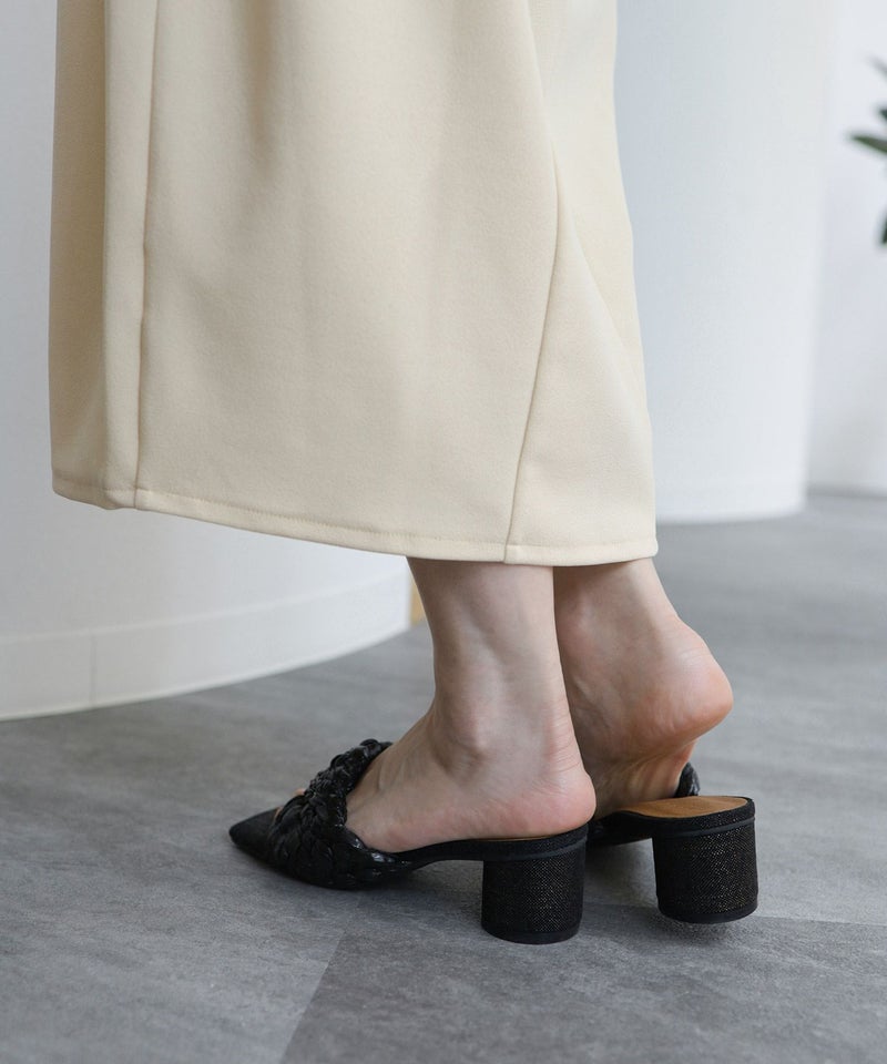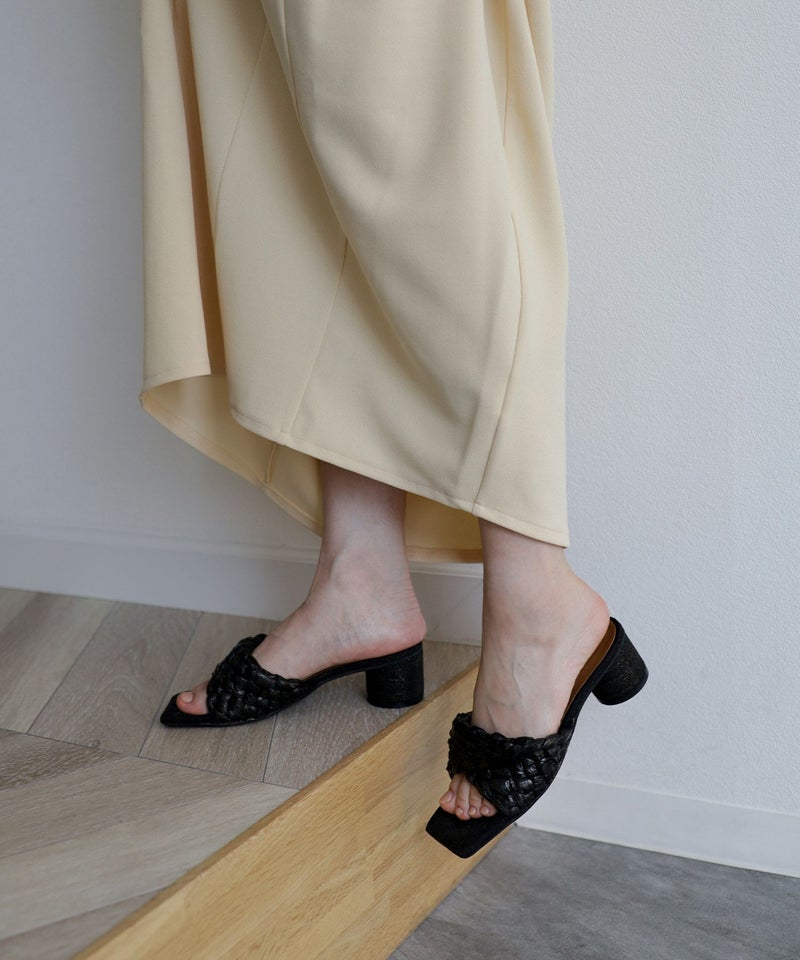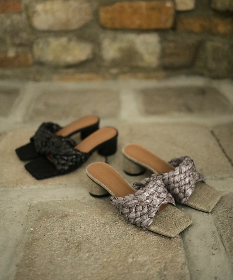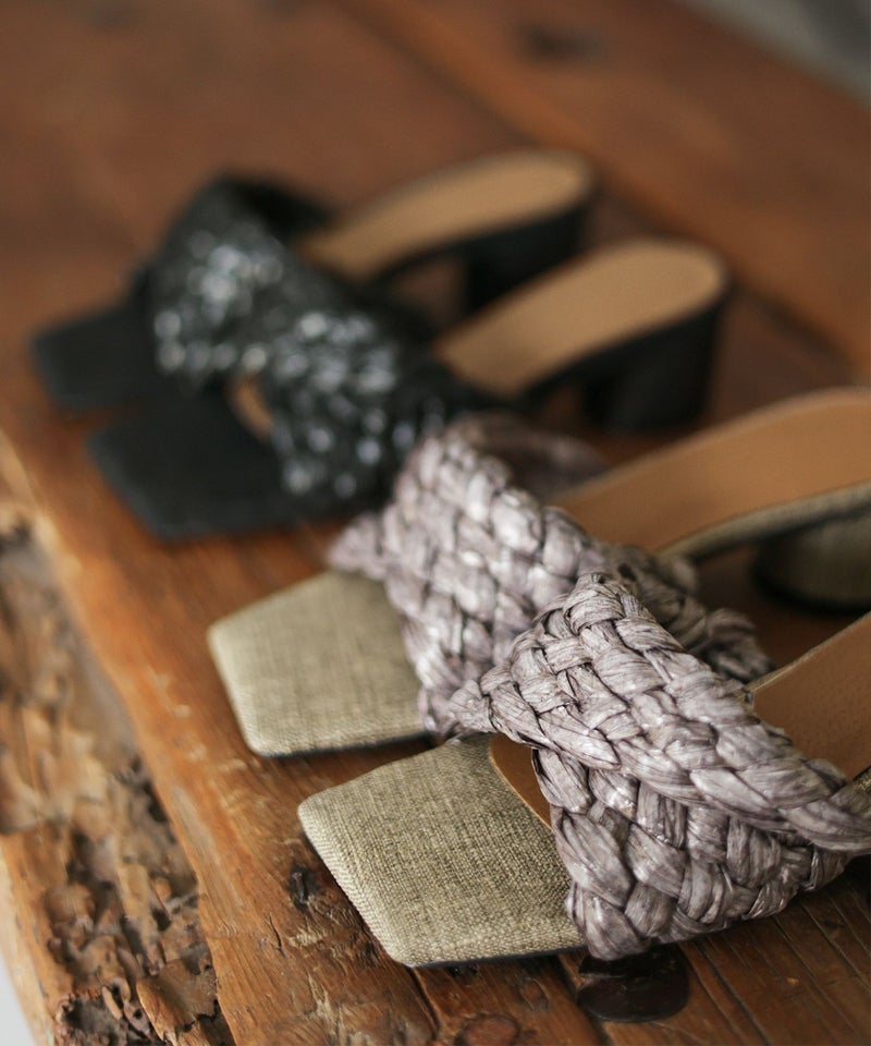 編み込みデザインサークルヒールミュールサンダル▲返品不可