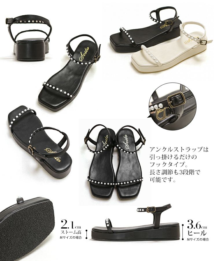 商品説明華やかで上品な輝きを放つパールが目を引くストラップサンダル。