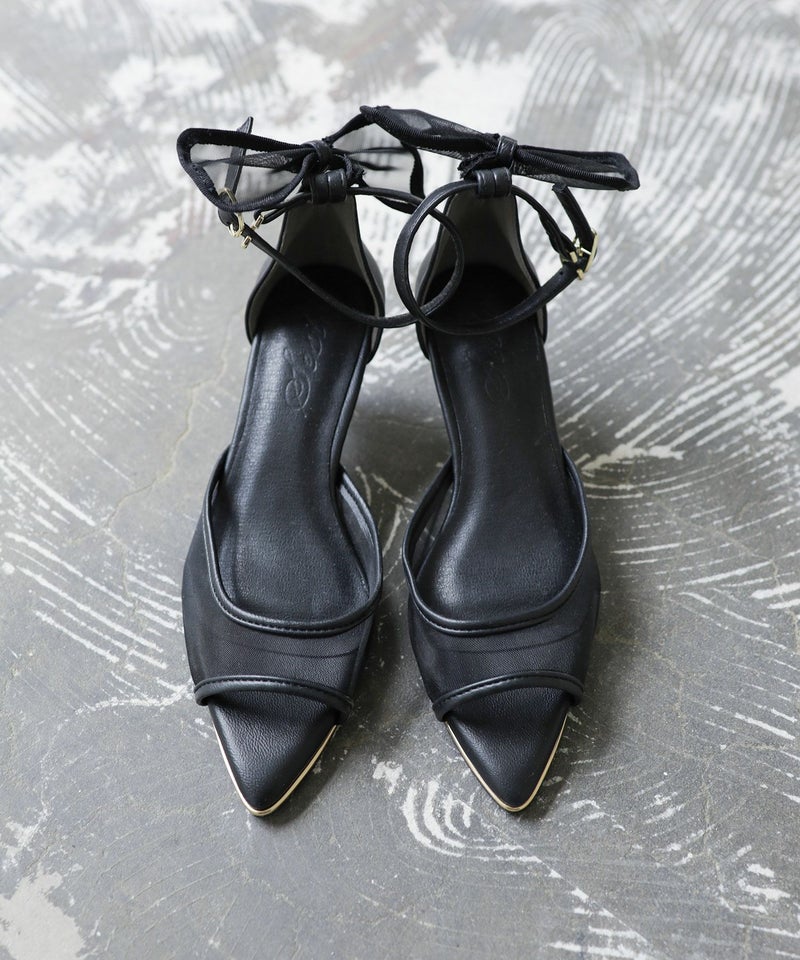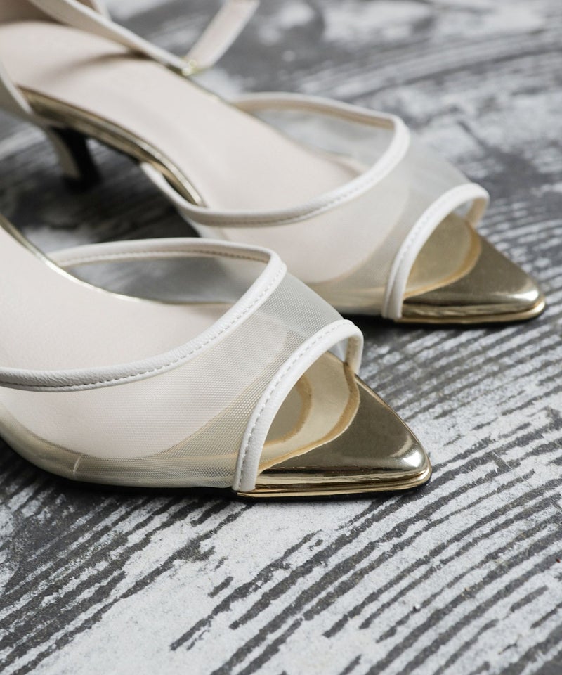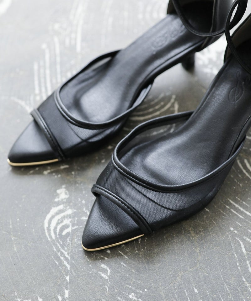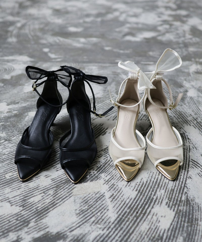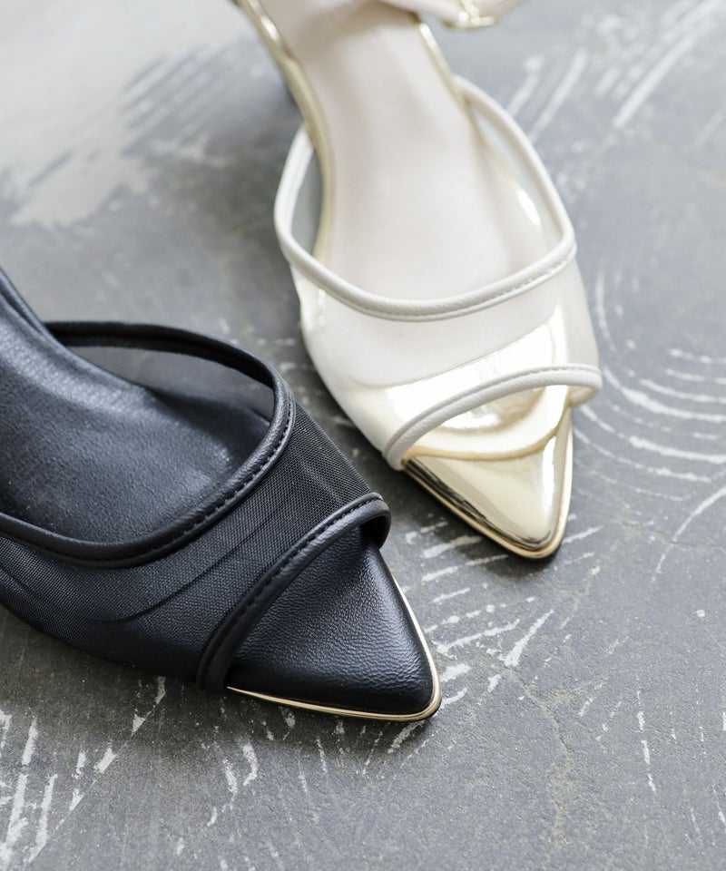 ツンと尖ったトゥで足先まですらっと美しく。ゴールドのメタリックなピースで縁取ることで、つま先をぶつけても生地を守ってくれて傷つきにくく、きれいに長く使えます。