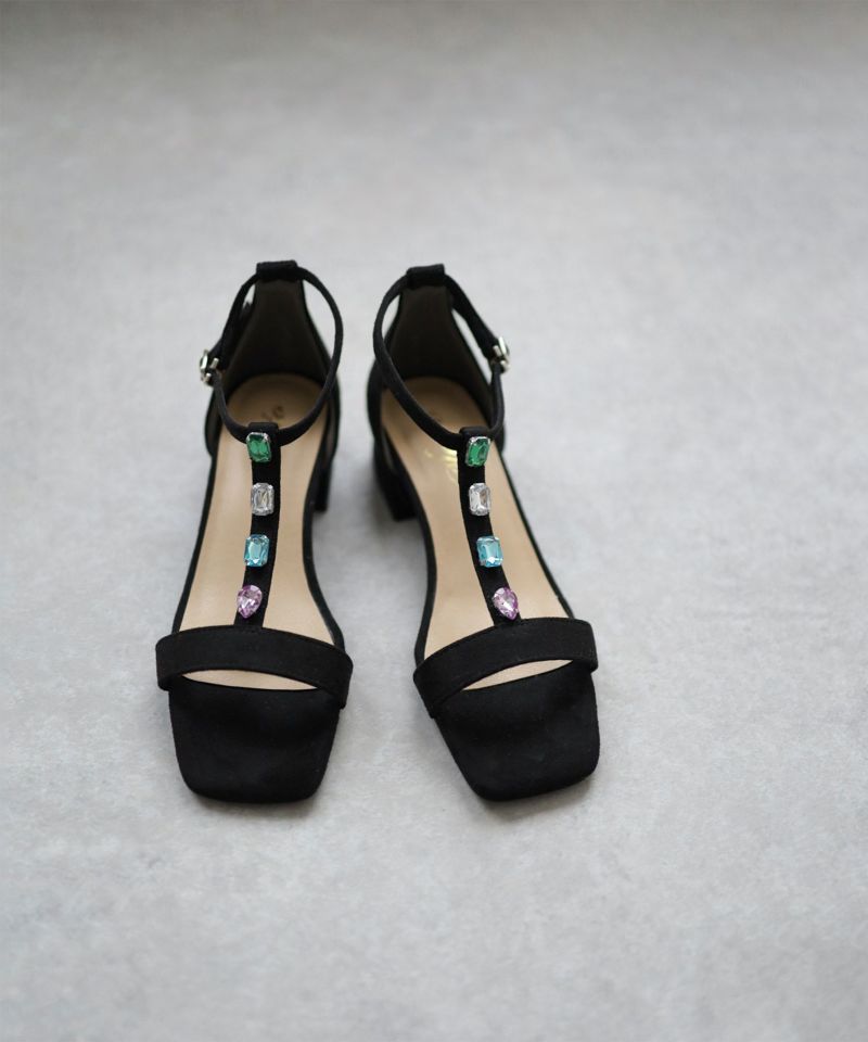 キャンディのようなカラフルなビジューをデコレーションして、特別感をプラスしたストラップサンダル。